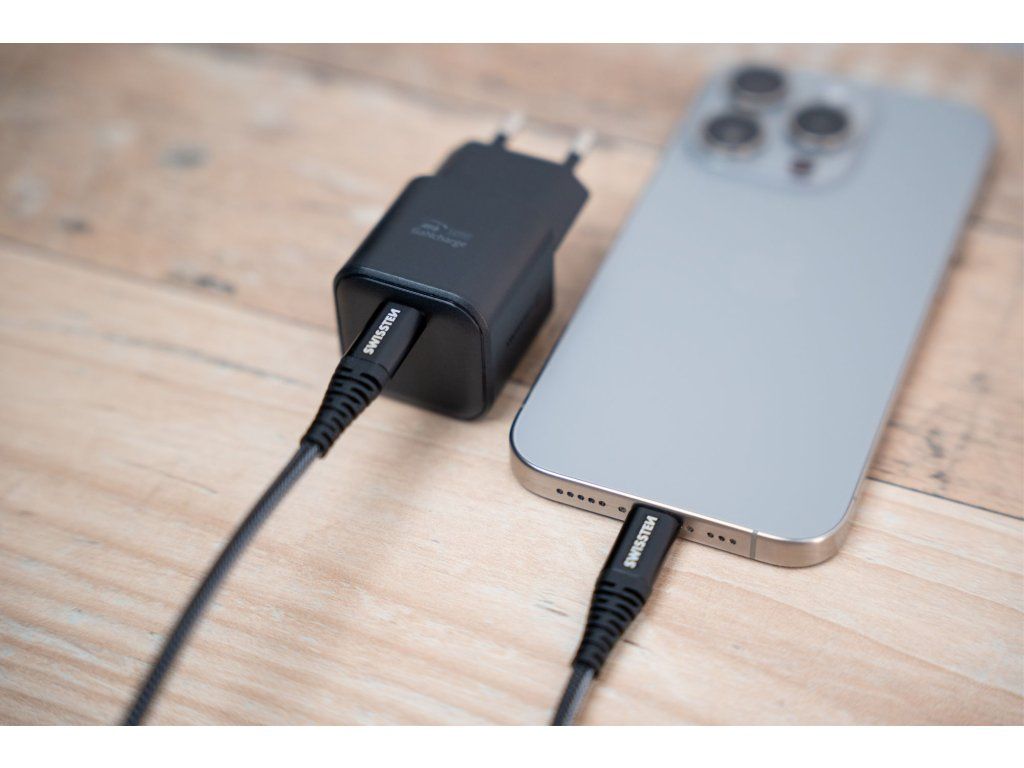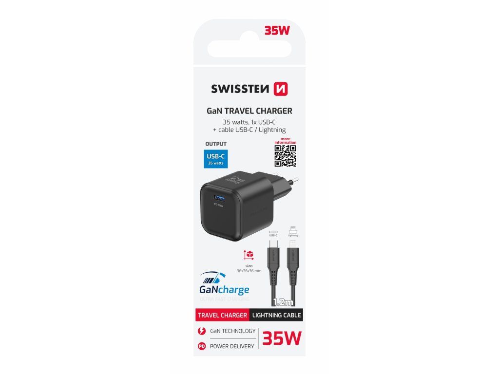 SWISSTEN SÍŤOVÝ ADAPTÉR GaN 1x USB-C 35W POWER DELIVERY ČERNÝ + DATOVÝ KABEL USB-C/LIGHTNING 1,2 M ČERNÝ