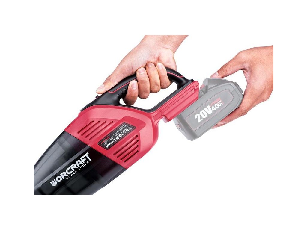 Akumulátorový prenosný vysávač Worcraft CPVC-S20Li je určený na vysávanie prachu a zdraviu neškodlivých suchých hmôt. Vysávač je určený na používanie v domácnosti alebo do auta. Odolná zberná nádoba disponuje objemom 500 ml. Výkonný vysávač poskytuje podtlak => 3,8 kPa. Je vybavený textilným filtrom a prekvapí svojou nízkou hmotnosťou len 1,2 kg. Vďaka nej sa ľahko ovláda. Zapína a vypína sa jednoducho, pomocou ON/ OFF tlačidla. Uvoľňovacie tlačidlo slúži na uvoľnenie zbernej nádoby. Bežný čas nabíjania batérie je cca 1 – 1,5 hodiny. Batéria je tepelnou poistkou chránená proti prebitiu, preto môže v nabíjačke zostať dlhší čas bez poškodenia (však, nie dlhšie ako 24 hodín).