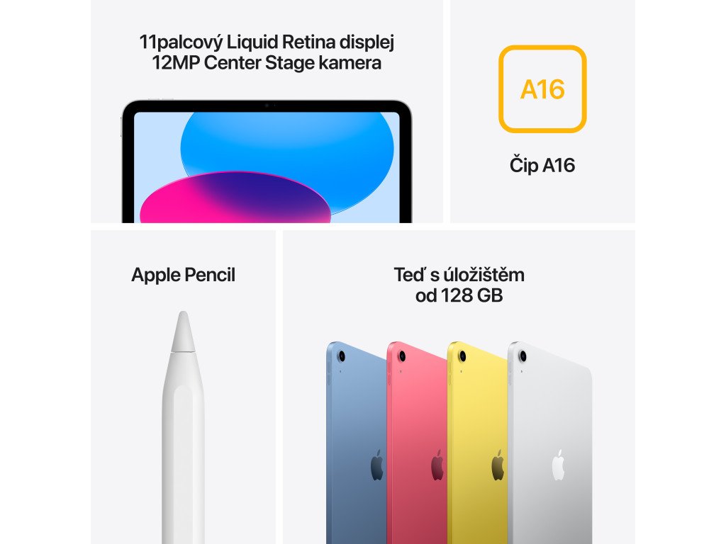 Úplne nový iPad je schopnejší, intuitívnejší a zábavnejší. Má prepracovaný dizajn s 10,9-palcovým displejom Liquid Retina na celej obrazovke a dodáva sa v štyroch nádherných farbách. Môžete na ňom pohodlne pracovať, tvoriť a pripájať sa. A keď k tomu pridáte praktické príslušenstvo navrhnuté špeciálne pre iPad, získate všestranný nástroj na čokoľvek, čo vás baví. So systémom iPadOS funguje všetko, čo na iPade robíte, hladko a jednoducho. Či už ide o používanie dvoch aplikácií vedľa seba, úpravu a zdieľanie fotografií, alebo prístup k súborom. Všetky úlohy zvládnete na jednom zariadení. Robte si poznámky, spolupracujte a plynule preskakujte medzi aplikáciami. iPad je stvorený na produktívnu prácu všetkého druhu, takže si môžete vytvoriť koláčový graf a koláčový recept ako nikto iný. A vďaka čipu A14 Bionic všetko beží hladko a svižne. Upravuj 4K video v iMovie, plánuj výlet s priateľmi alebo hraj graficky náročné hry. Batéria vydrží celý deň, takže sa nemusíš obmedzovať. Upravuj tabuľky, dolaďuj prezentácie v programe Keynote, rob si úžasné poznámky. Na klávesnici Magic Keyboard Folio sa pohodlne píše a trackpad je skvelý, keď potrebujete presné ovládanie. Na kreatívne vyjadrovanie, kreslenie a všetky svoje nápady potrebujete výkon a priestor. iPad má oboje vďaka fantastickému 10,9-palcovému displeju Liquid Retina. Takže si zoberte Apple Pencil a neváhajte čmárať, komentovať dokumenty, robiť si poznámky a podobne. Jednoducho si čmárajte. Vysokokvalitné integrované mikrofóny a stereofónne reproduktory v horizontálnej orientácii ti dávajú slobodu zachytávať a upravovať zvuk kdekoľvek. Nahrajte podcast, vytvorte beat, skomponujte filmovú hudbu - vaše kreatívne projekty budú znieť fantasticky. Fotografujte pomocou 12 Mpx širokouhlého zadného fotoaparátu. Snímajte a upravujte fotografie, strihajte videá v rozlíšení 4K, skenujte a anotujte dokumenty - to všetko na iPade. Nový 12 Mpx ultraširokouhlý predný fotoaparát ťa dostane do správneho uhla na FaceTime hovory, videokonferencie a selfie videá, pretože je orientovaný horizontálne. Vycentrovanie záberu ťa udrží v strede obrazu.Dodatočné parametre