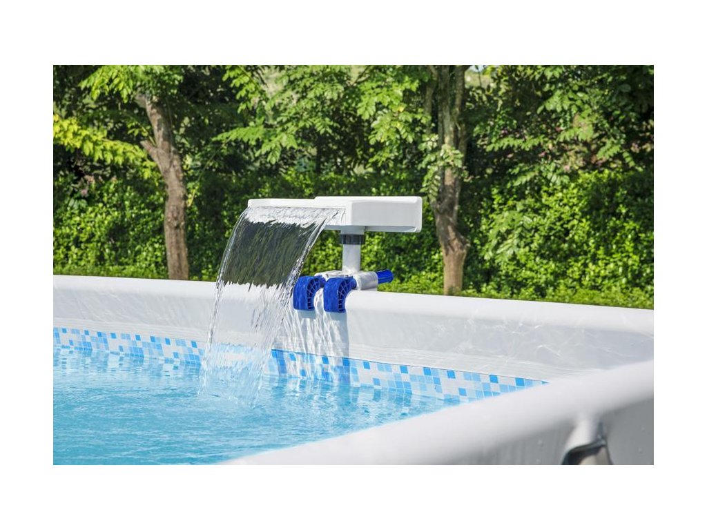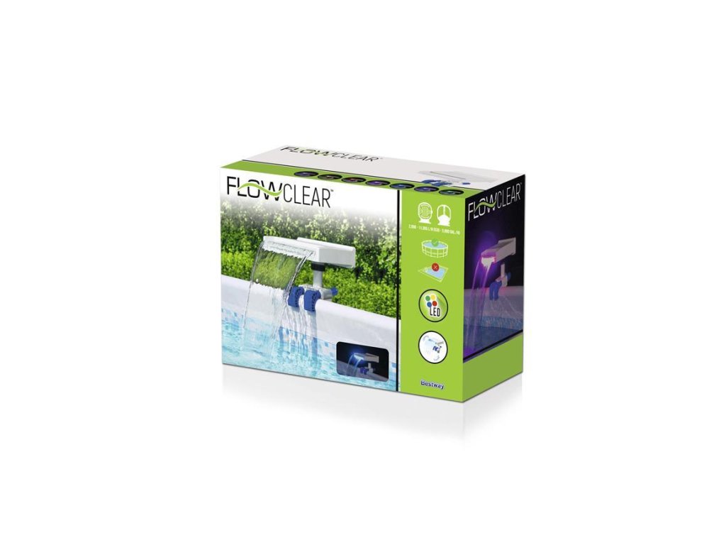Ukľudňujúci LED vodopád Bestway® FlowClear™ 58619 je skvelým doplnkom každého bazénu. Vodopád nainštalujete rýchlo a jednoducho. Je kompatibilný so všetkými filtračnými systémami s prietokom 2006 - 11355 l/h. Vodopád udržuje nepretržitý prietok. LED svetlo ponúka 8 režimov a automatické vypnutie po 2 hodinách prevádzky. Svetlo je napájané prostredníctvom 3 AA batérií. Samozrejmosťou je vodotesnosť IP 67.