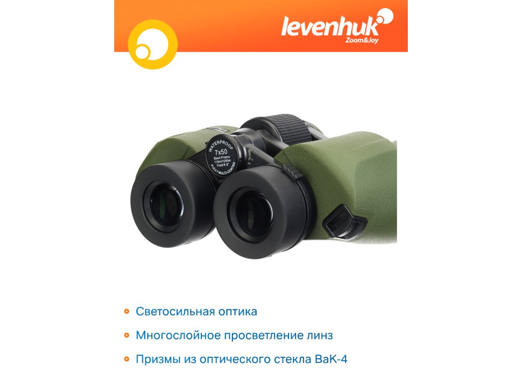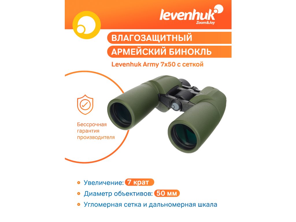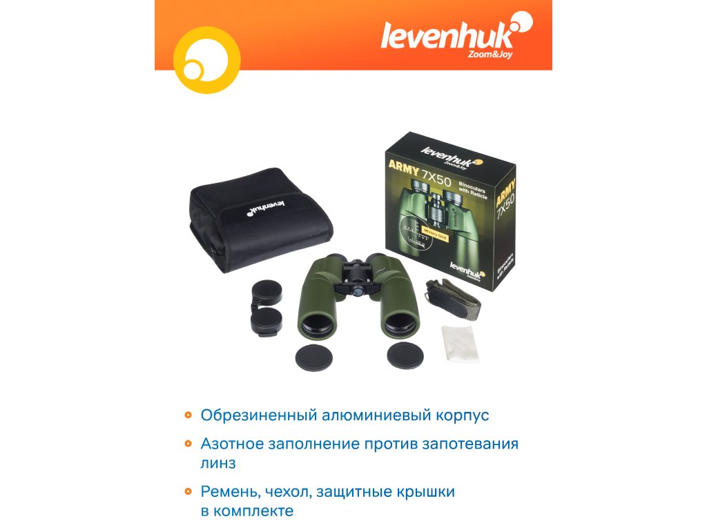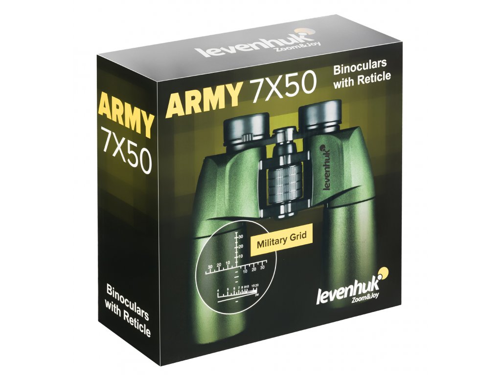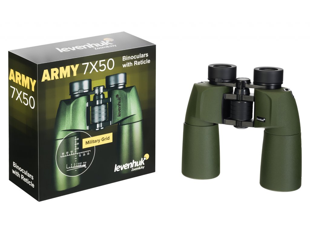 Poľovnícky ďalekohľad Levenhuk Army 7x50 so zameriavačom, disponuje vysokou apertúrou (50mm). Funkčnosť binokuláru vysoko oceňujú poľovníci, rybári, turisti, ale aj a vodáci. Perfektne sa hodí na profesionálne použitie, ako napríklad na prieskum a ochranu územia. S armádnym binokulárom môžete pozorovať krajinu a vzdialené ciele so 7-násobným zväčšením.
