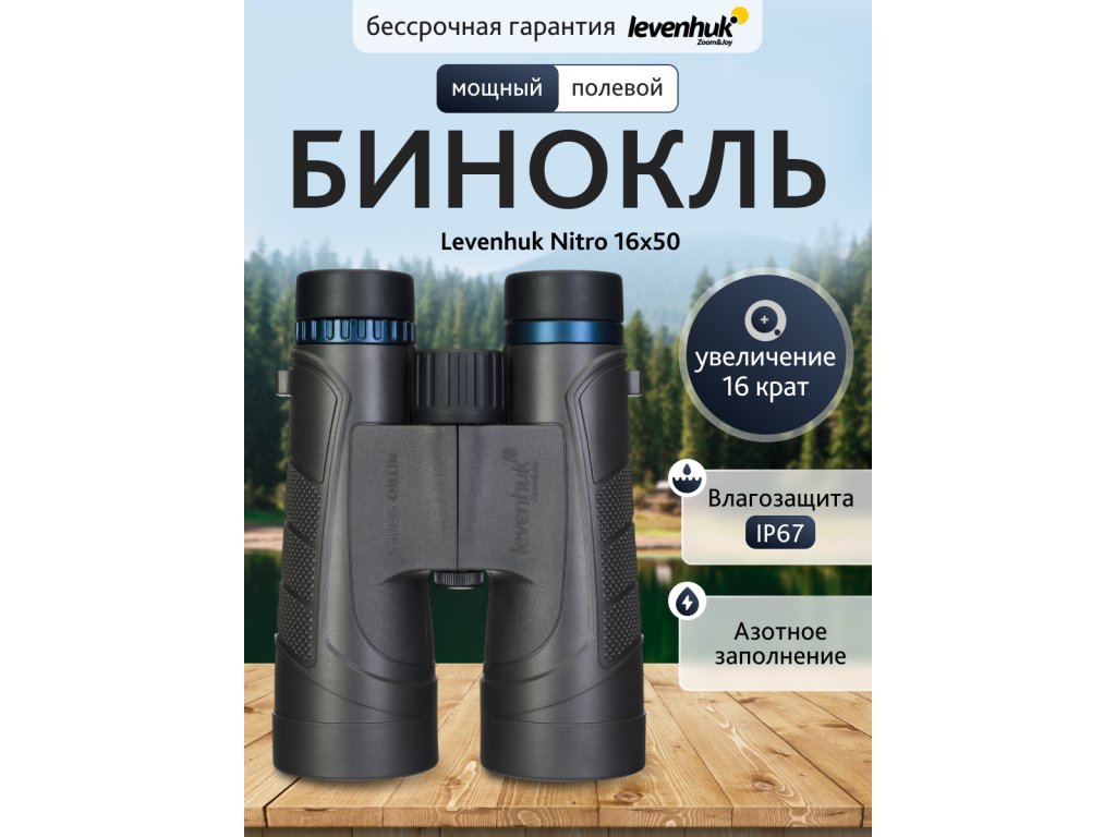 Binokulárny ďalekohľad Levenhuk Nitro 16x50 je kombináciou vynikajúcich optických vlastnosti, ľahkého tela a spoľahlivosti. Binokulár sa stane skvelým spoločníkom pre každého lovca alebo rybárov. Viacvrstvový antireflexný povlak na všetkých optických prvkoch a clona s priemerom 50 mm zabezpečujú dostatočné množstvo svetla na vytvorenie čistého obrazu aj za oblačného počasia alebo za súmraku. 16 násobné zväčšenie vám umožní detailne preskúmať zaujímavé objekty aj na veľkú vzdialenosť.