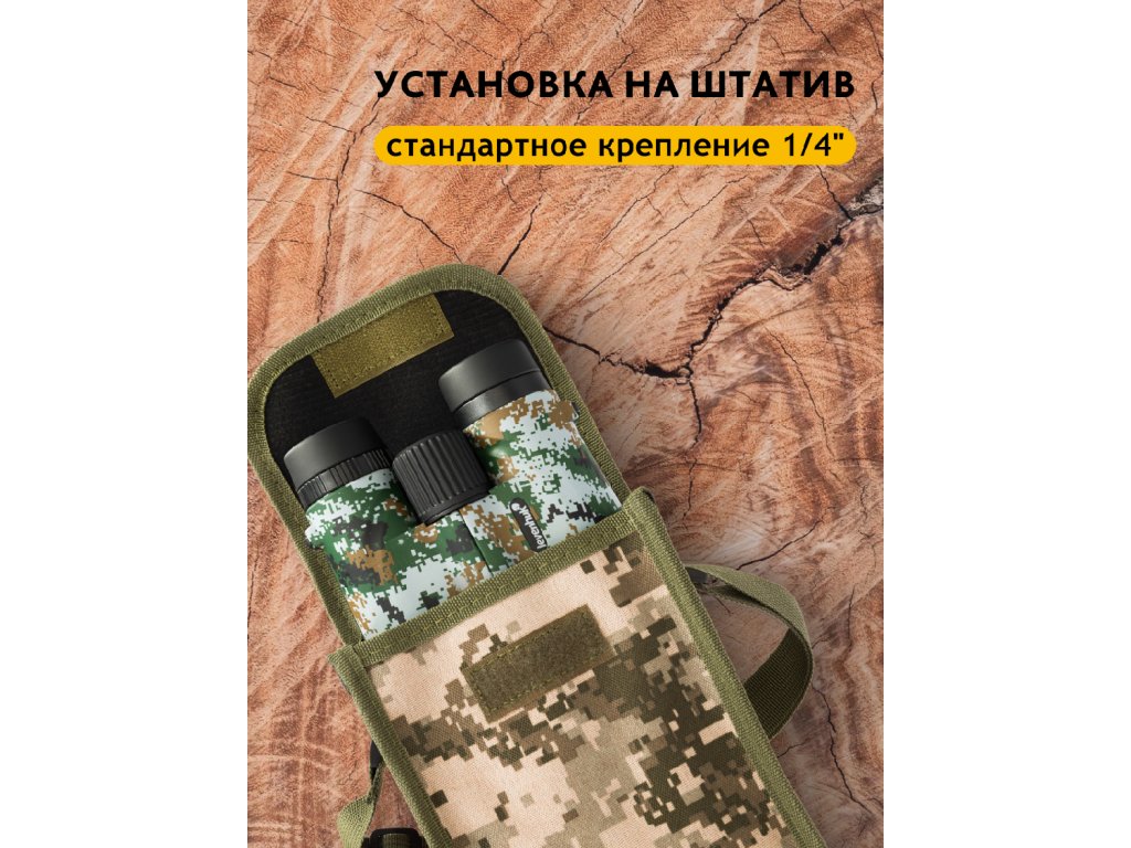 Optika binokulárneho ďalekohľadu Levenhuk Camo Dots 10x42 je zložená zo strešných hranolov plne pokrytých viacnásobnou povrchovou úpravou, ktoré sú vyrobené z vysokokvalitného skla BK-7. Pozorovaný obraz je jasný, vysoko kontrastný a ostrý. Jednoducho ním môžete zaostriť na cieľ vo vzdialenosti 3 m. Centrálne zaostrovacie koliesko, slúži na nastavenie ostrosti. Očnice sa dajú sklopiť, dá sa zmeniť medzipupilárna vzdialenosť a taktiež sa dajú nastaviť dioptrie v širokom rozsahu. Binokuláre sú vhodné pre všetkých používateľov a sú spoľahlivým optickým prístrojom v každej situácii. Turistický ďalekohľad môžete namontovať na statív so štandardným závitom - adaptér je potrebné dokúpiť.