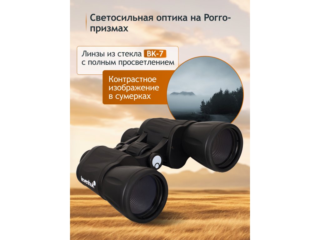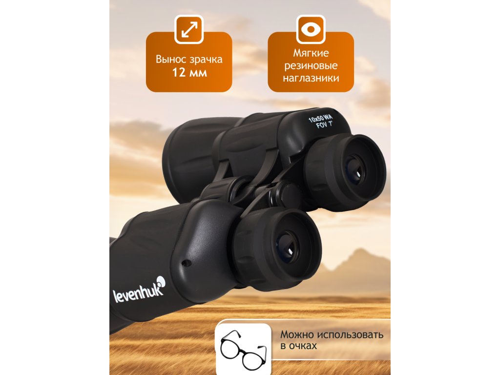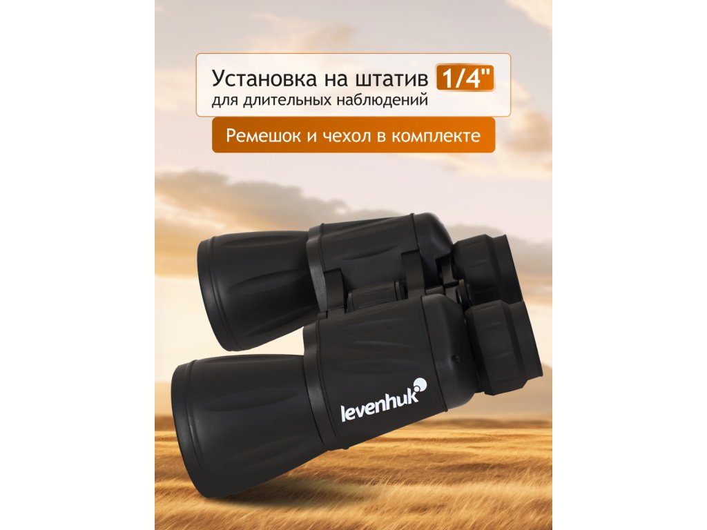 The Levenhuk New Atom 10x50 binoculars are a simple yet reliable instrument featuring a 50mm aperture and 10x magnification. This is a classic field model based on a Porro prism design. They are suitable for a variety of tasks, even stargazing. Their large objectives and 5mm exit pupils deliver exceptional light transmission. They have fully coated optics, are crafted from BK-7 borosilicate glass, and they minimize light loss. Even in the dimmest light, these binoculars are capable of delivering high-contrast, sharp images with rich, vibrant colors.