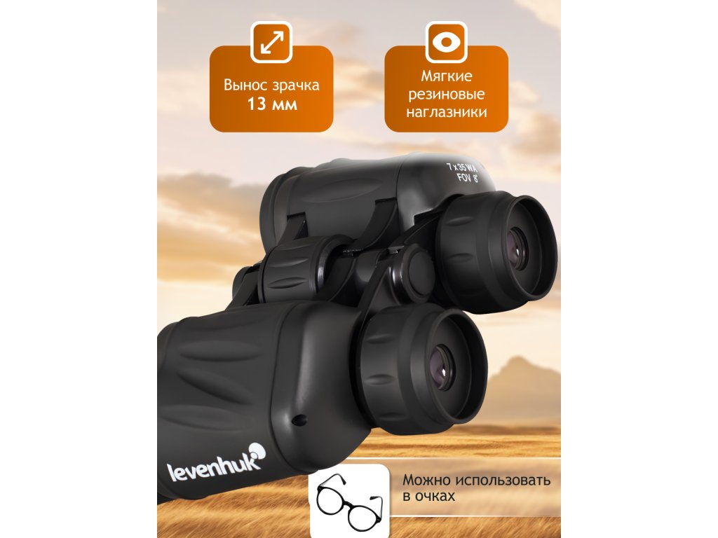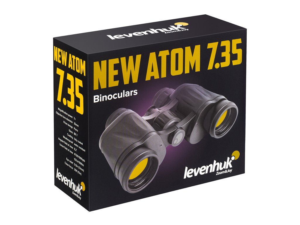 The Levenhuk New Atom 7x35 binoculars feature 35mm objective lenses and 7x magnification with Porro prisms in a classic design. They are ideal for hunting, fishing, hiking, or sporting events. The BK-7 glass and fully multi-coated optics ensure clear, high-contrast images with rich colors across a wide range of lighting conditions.