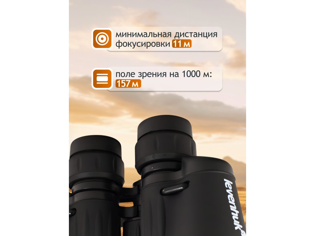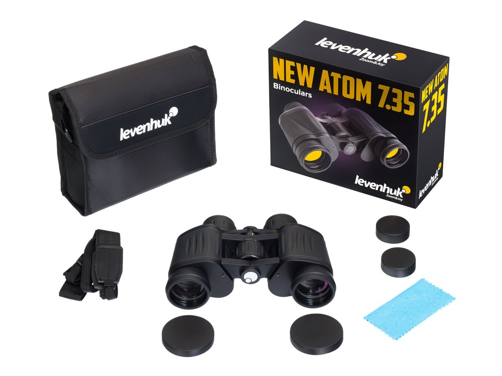 The IPX3 rating indicates that the instrument is splash-proof, meaning that it can withstand splashes of water without damage, although it is not fully waterproof. The aluminum body is rubber-armored for a better grip, preventing it from slipping out of wet hands. Weighing under 700g, the Levenhuk New Atom 7x35 binoculars won’t weigh you down on the go. For extended viewing sessions, it can be conveniently mounted on a tripod using an adapter (sold separately). The package includes eyepiece and objective lens caps, a neck strap, a carrying pouch, and a lens cleaning cloth.