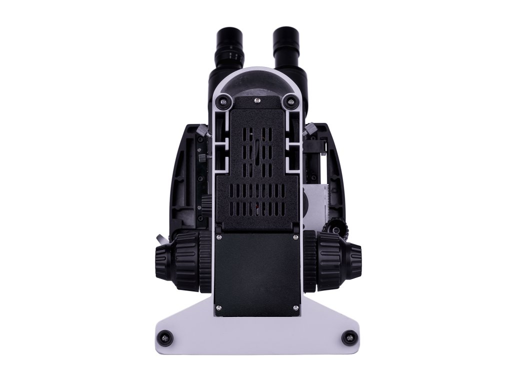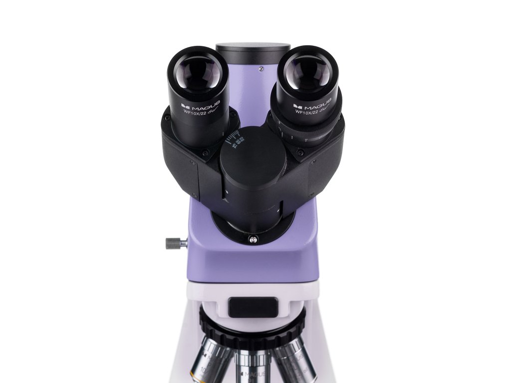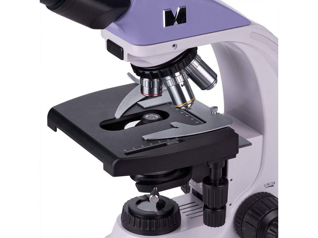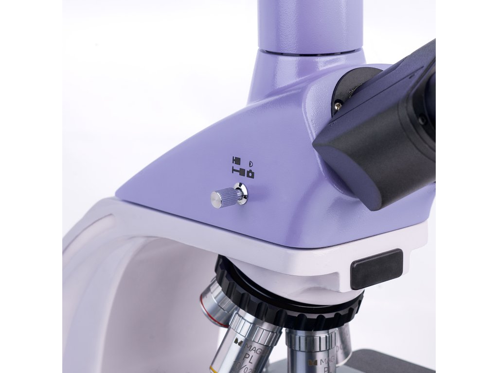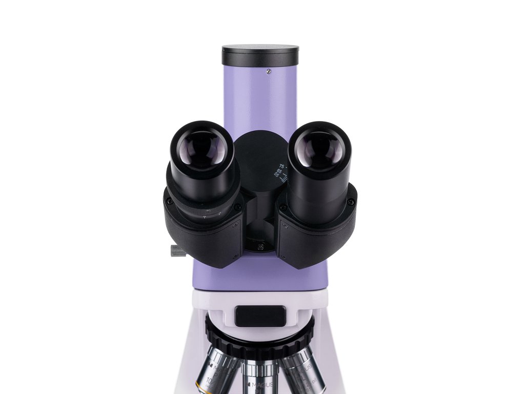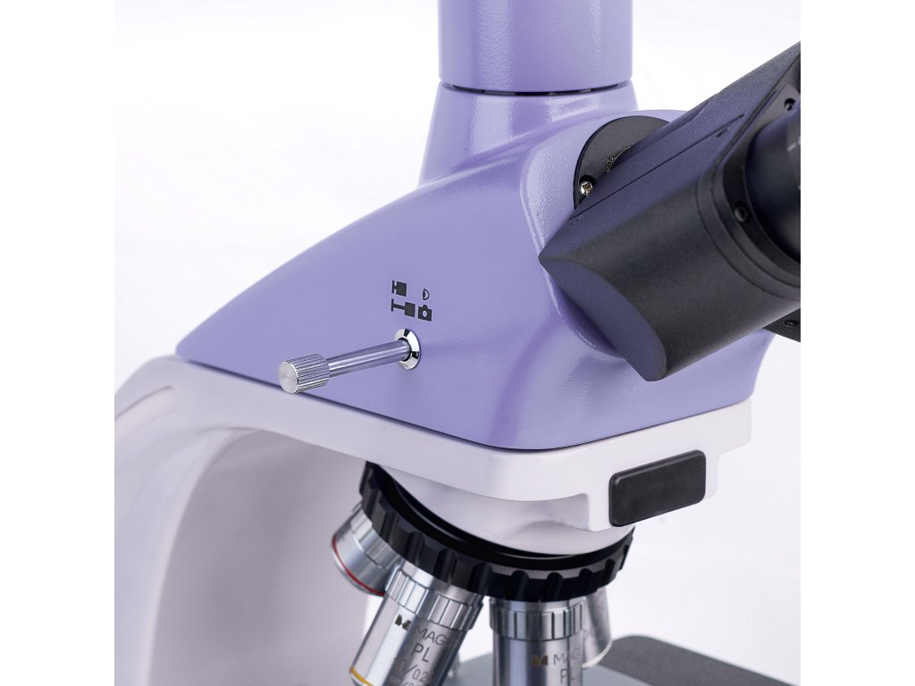 Trinokulárna hlavica má dva okulárové tubusy na pozorovanie a jeden vertikálny tubus, ktorá je určený pre montáž digitálneho fotoaparátu. Fotoaparát nie je súčasťou balenie, je potrebné ho zakúpiť samostatne. Tubusy sú naklonené o 30 °, čo zabezpečuje pohodlnú pozorovaciu pozíciu aj pri dlhodobej práci, a dajú sa otáčať o 360 °, vďaka čomu si ich môžete prispôsobiť svojej výške. Na ľavom tubuse sa nachádza krúžok pre nastavenie dioptrií. Objektívy sa umiestňujú do revolverového nosiča, ktorý má 5 slotov. Štyri objektívy sú súčasťou balenia a jeden slot ostáva voľný pre inštalovanie ľubovoľného objektívu. Počas pozorovania môžete sledovať objektív, ktorý je zasunutý do optickej dráhy, pretože revolverový nosič je orientovaný smerom dovnútra, čím sa uvoľňuje priestor nad pracovným stolíkom. Rozsah zväčšenia sa pohybuje od 40x do 1000x v základnej konfigurácii. Pridaním ďalších objektívov zvýšite hornú hranicu zväčšenia.