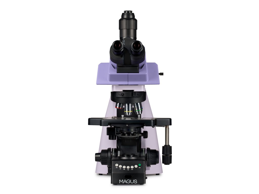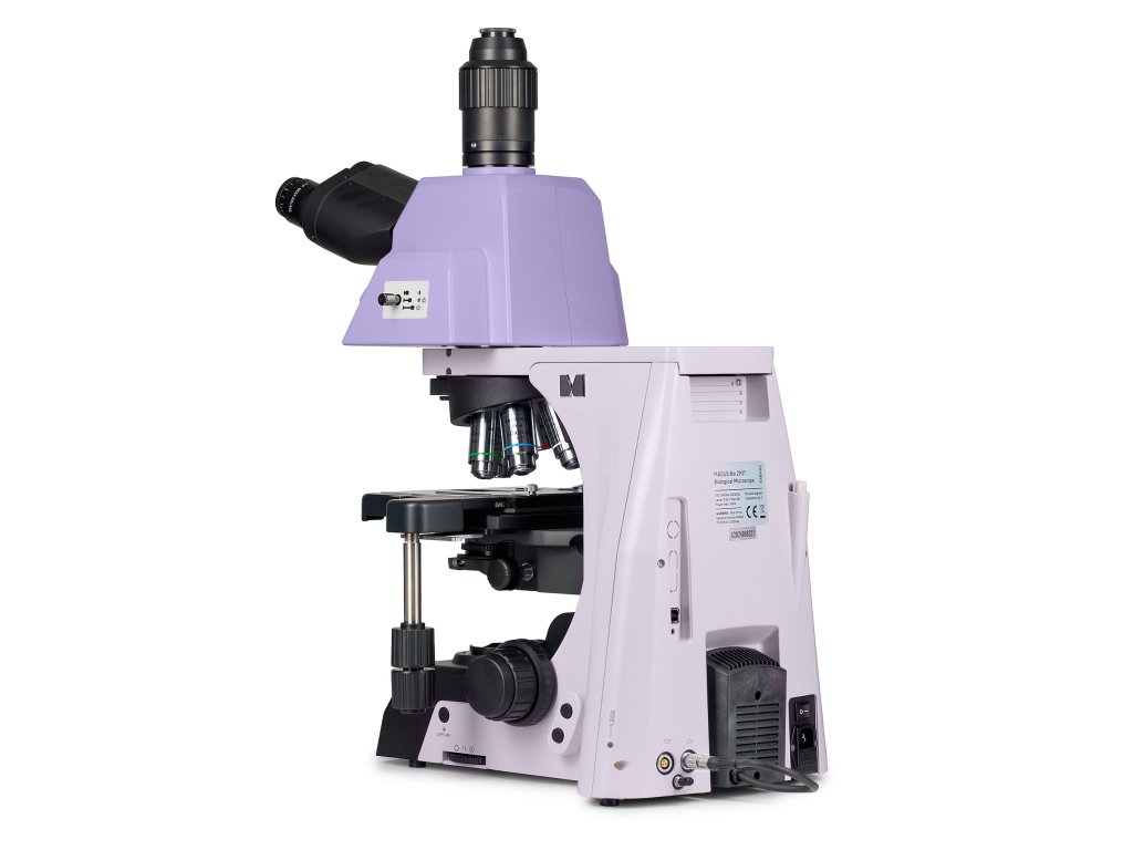 Zväčšenie: 40-1000x. Trinokulárna hlava s nastaviteľným sklonom, motorizovaný revolverový nosič objektívov a kondenzor, rovinné achromatické objektívy, 3 W LED osvetľovacia sústava, inteligentný systém ovládania osvetlenia