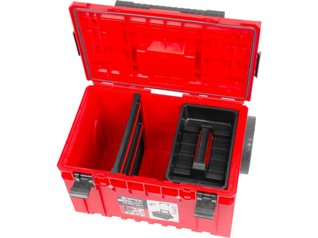 RED ULTRA HD Qbrick je špeciálna edícia produktov Qbrick System ONE vyrobená z ultra odolného plastu, ktorý sa vyznačuje mimoriadnou odolnosťou voči mechanickému poškodeniu. Vykonané nárazové testy potvrdzujú jeho mimoriadnu odolnosť aj v podmienkach pod 0 °C. QS ONE Cart RED Ultra HD je veľkokapacitný mobilný box na náradie vybavený veľkými kolesami namontovanými na kovovej osi. Je vybavená teleskopickou rukoväťou z eloxovaného hliníka. Pre lepšiu organizáciu interiéru je truhlica vybavená jednou priehradkou a jednou nádobou . Štandardný kryt (VARIO) v QS ONE Cart je vybavený prídavnými konektormi, ktoré umožňujú pripojenie tejto verzie krytu k modelom boxov na náradie z rady Qbrick System PRO (500, Toolcase, Toolbox, Organizer 100,200,30 0 a alternatívne PRO 600). Ide o unikátnu verziu boxu, vďaka ktorej môže užívateľ kombinovať prvky z dvoch produktových radov.