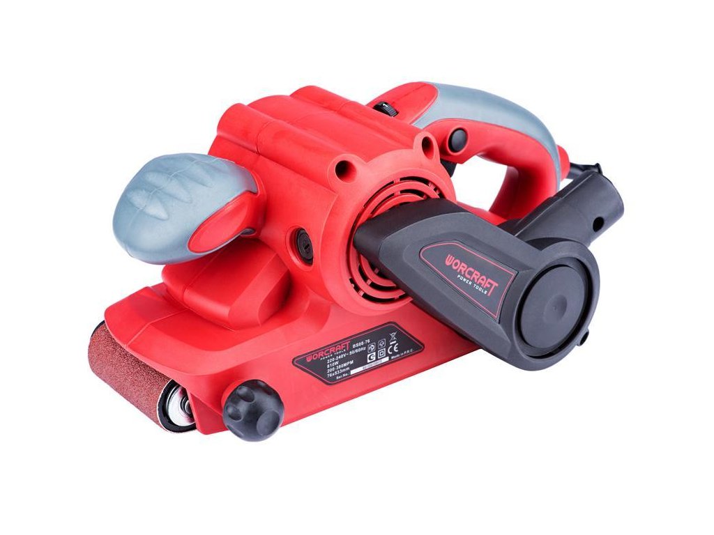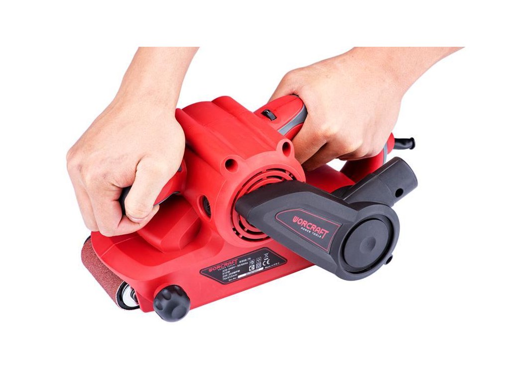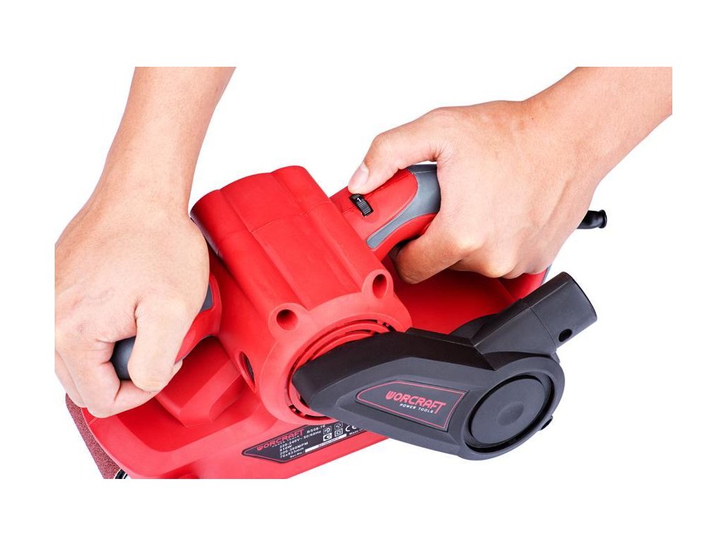 Výkonná elektrická pásová brúska Worcraft BS08-76 s príkonom 810 W je skvelým pomocníkom každého kutila pri suchom brúsení. Je vhodná na brúsenie dosák a odstraňovanie materiálov z dreva, plastu, kovu, atď. O komfortnú prácu s pásovou brúskou sa postarajú protišmykové pogumované rukoväte, jedna menšia vpredu a jedna veľká vzadu. Hlavnú úlohu pri brúsení zohráva okrem motora aj brúsiaci pás. Jeho rozmery sú 76 x 533 mm. Pás jednoducho priložíte na potrebný materiál a brúsite. Po opotrebovaní brúsneho papiera je potreba vymeniť ho za vhodný typ podľa uvedených rozmerov. Vďaka jednoduchému mechanizmu na pravej strane brúsky nebudete mať problém s rýchlou výmenou brúsneho pásu. Oceníte tiež praktický gombík na ľavej strane brúsky, ktorý slúži na vycentrovanie brúsneho pásu.