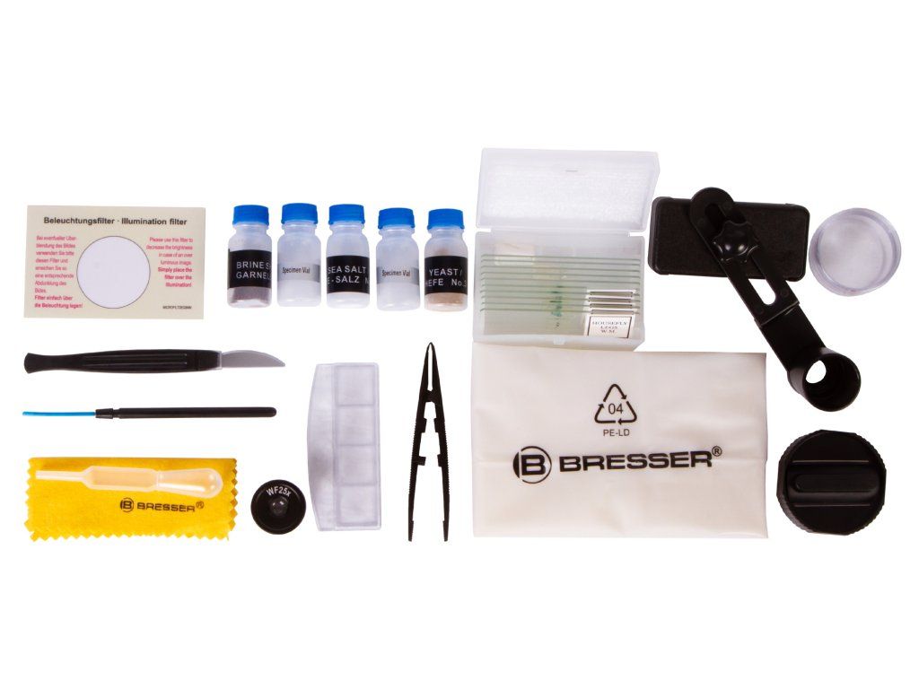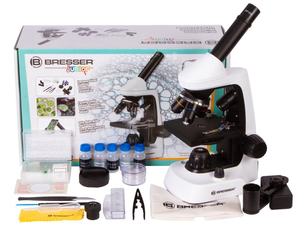 Juniorský mikroskop Bresser má zväčšenie až 2000x a nový inovatívny držiak na smartfón, ktorý umožňuje fotografovať cez mikroskop. Pre zaistenie plnej výbavy je súčasťou balenia aj perfektné úvodné príslušenstvo. Patria sem okrem iného dva okuláre so širokým zorným poľom, farebný filtračný disk, množstvo podložných sklíčok a úložné nádoby. Vďaka elegantnému dizajnu Bresser má mikroskop mnoho užitočných funkcií. Nastaviteľné LED osvetlenie možno použiť ako dopadajúce svetlo na pozorovanie nepriehľadných objektov a ako prechádzajúce svetlo na pozorovanie priehľadných objektov.