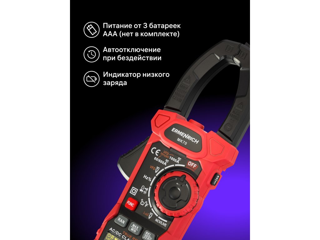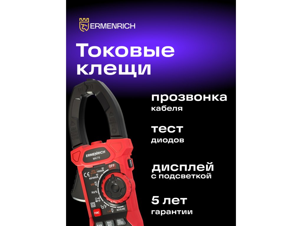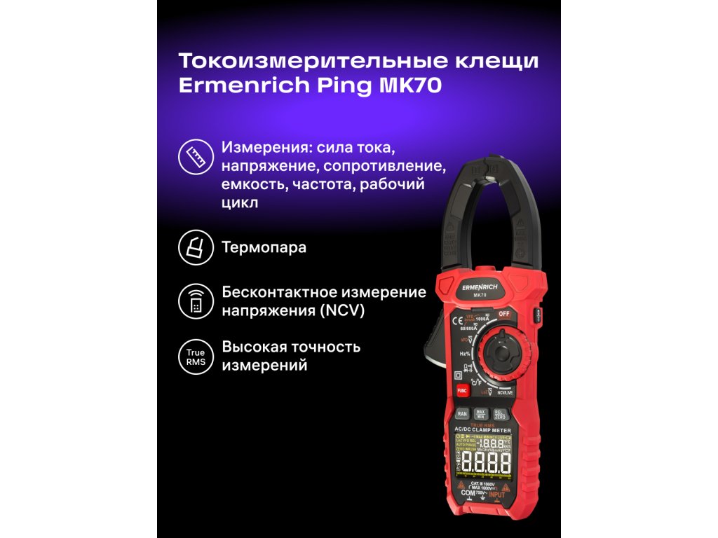 Ermenrich Ping MK70 je kliešťový merač s funkciou merania jednosmerného prúdu. Taktiež ním viete merať aj striedavý prúd. Merač je kombináciou funkcií ďalších 6 meracích prístrojov - ohmmetra, voltmetra, merača frekvencie, merače kapacity, merače pracovného cyklu a teplotného snímača na báze termočlánku. Aby kliešťový merač dosahoval vysokú spoľahlivosť merania, je výpočet založený na skutočnej strednej kvadratickej hodnote (True RMS). Vďaka jeho funkčnosti uspokojí potreby nie len začínajúcich majstrov a domácich kutilov, ale aj profesionálnych elektrikárov.