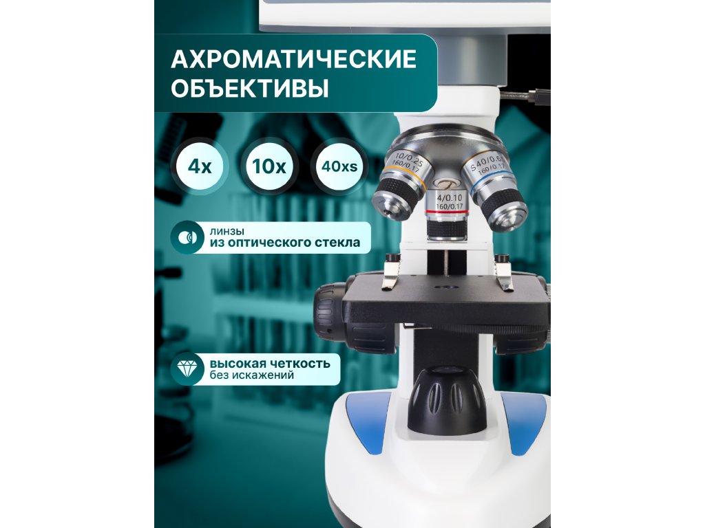 Optický systém pozostáva z achromatickej šošovky objektívu s rôznym zväčšením (4x, 10x a 40x). Celkové optické zväčšenie je od 40x do 400x a digitálne až 1600x. Obraz sa v reálnom čase zobrazuje na LCD obrazovke vo vysokom rozlíšení (1920x1080 pix ) a deteguje mikroštruktúry. Ovládacie tlačidla sú umiestnené na bočnom paneli a zadnej strane mikroskopu, vďaka čomu pôsobí minimalisticky. Môžete vykonávať hrubé a jemné zaostrovanie.