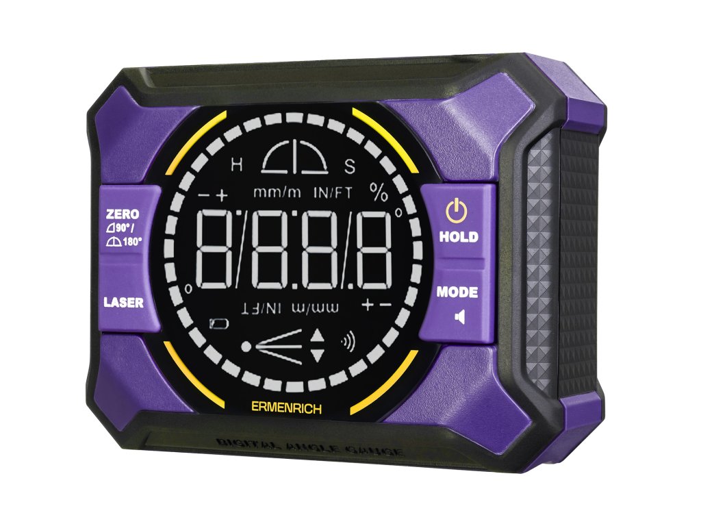 Vstavaný červený laser vytvára dve vzájomne kolmé čiary, čím okamžite vytvára referenčné osi bez potreby ďalšieho náradia. Elektronická indikácia „bubliny“ zostáva jasne čitateľná aj pri slabom osvetlení. Tlačidlo Hold zmrazí medzihodnoty, čo zjednodušuje prepravu prístroja. Tlačidlo Zero umožňuje nastaviť nový referenčný bod pre sériu opakovaných alebo symetrických meraní. Zariadenie vás upozorní zvukovým signálom, keď sa dosiahne cieľový uhol, čo je obzvlášť užitočné, keď displej nie je viditeľný.