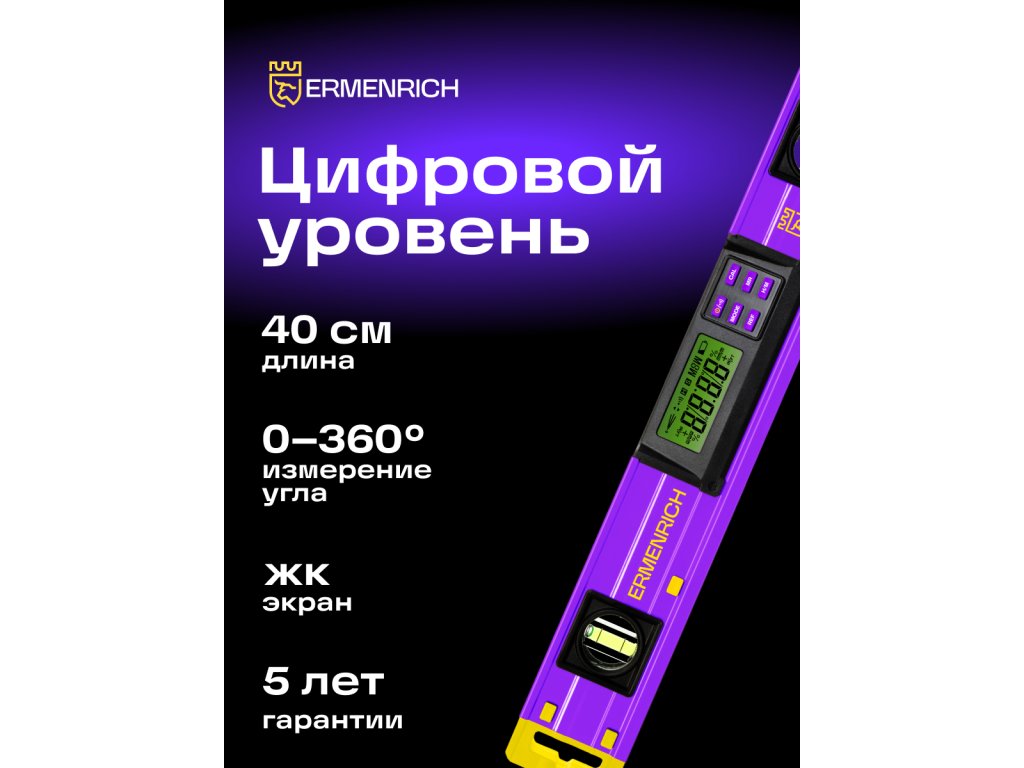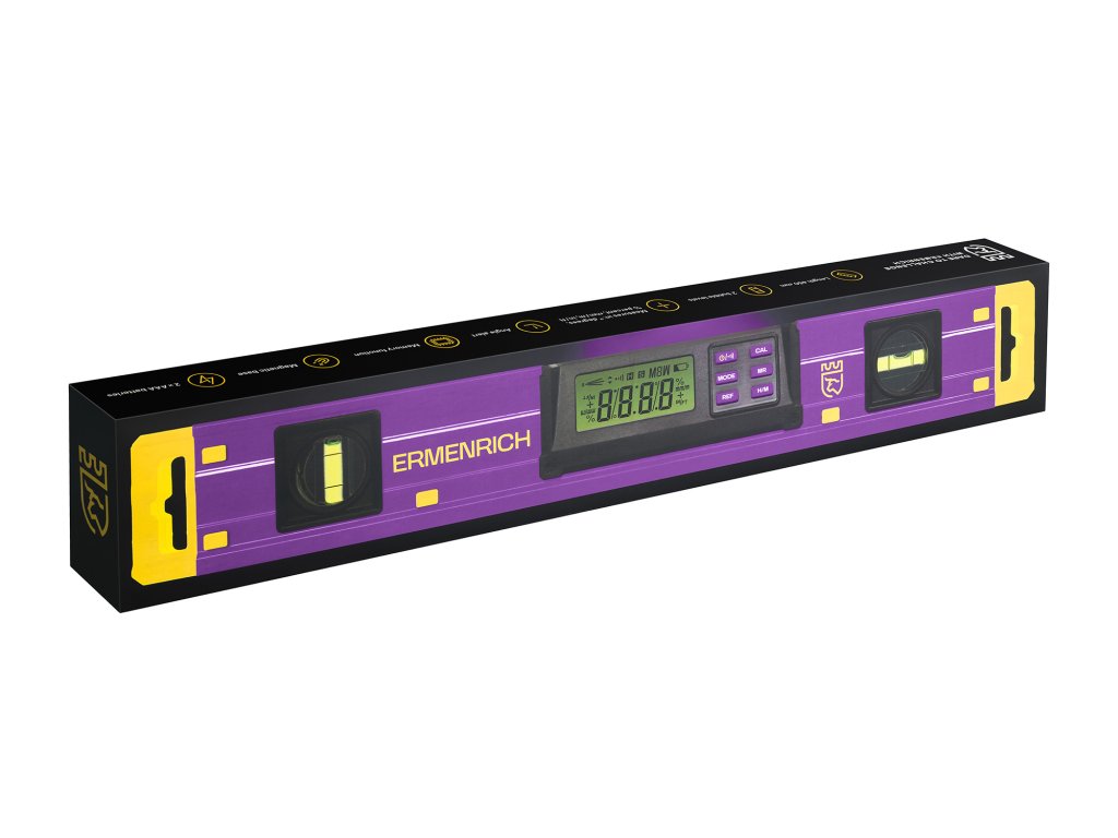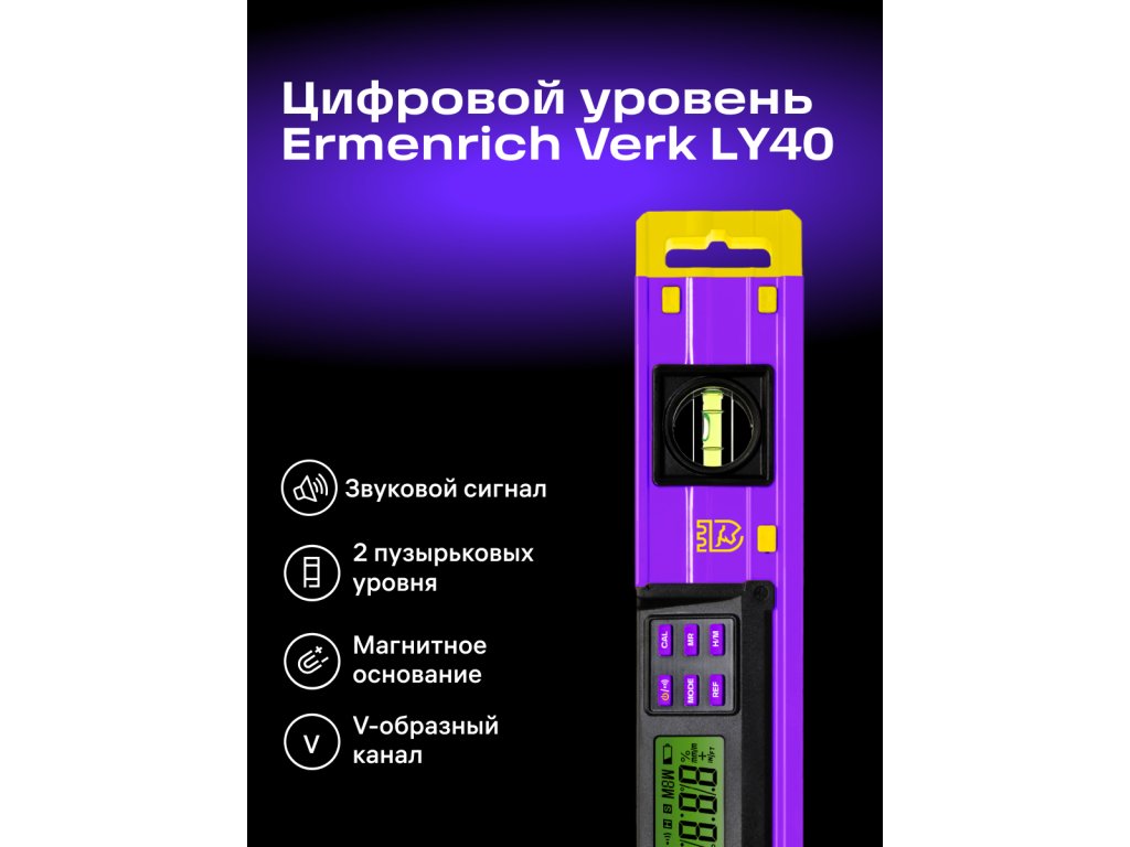 GPSR Levenhuk Europe V Chotejně 700/7 102 00 Praha 10 Česká republika 📞 +420 246 019 025 🌐 eu.levenhuk.comThe Ermenrich Verk LY40 Digital Level is a compact tool that combines the functionality of a digital angle meter and a standard bubble level. The level is designed for construction and repair work, alignment in the process of installation and commissioning, and accurate positioning of workpieces on metal-cutting and woodworking machines. The device can be used in everyday life – for the assembly and fixing furniture to the wall, curtain rods, and other design elements. The level measures the slope of an object in a range of 0–360° in four directions and displays the results on the LCD screen. It offers measurements in degrees, percentages, mm/m, and in/ft.