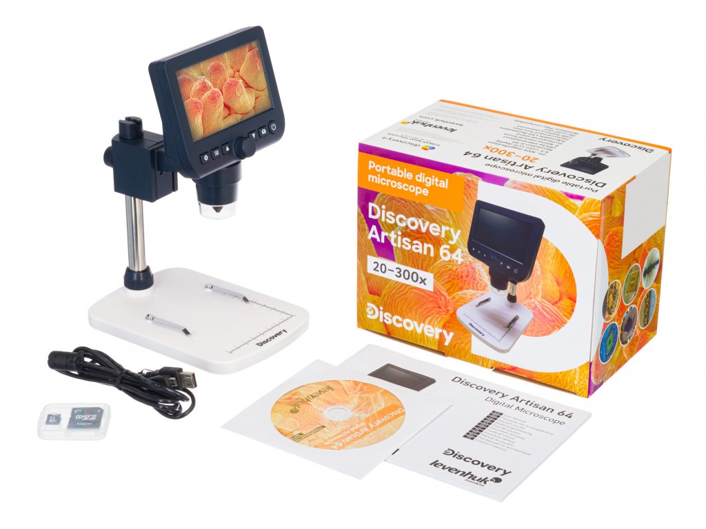 Digitálny mikroskop Discovery Artisan 64 je USB mikroskop, ktorý sa jednoducho používa a je určený najmä pre začiatočníkov. Je vybavený vstavanou LCD obrazovkou (4,3"), vďaka ktorej nie je nutné tento mini mikroskop prepájať s počítačom, ale môžete ho samozrejme využívať aj s PC. Je kompatibilný so zariadeniami s operačným systémom Windows a Mac OS (prostredníctvom USB kábla). Začiatočnícky mikroskop je možné využívať pri opravách malých predmetov, študovaní kovov alebo mincí.