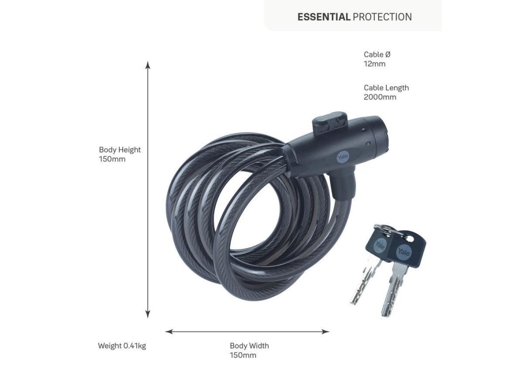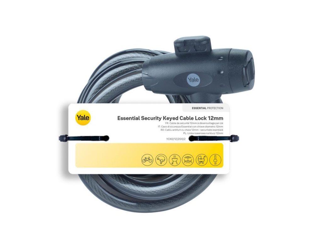 Lankový zámok na bicykel Yale na kľúč. Opletené oceľové lano. Odolnosť voči poveternostným vplyvom. Držiak zámku na bicykel - súčasťou balenia. Hrúbka oceľového lana: 12 mm. Dĺžka lana: 200 cm.