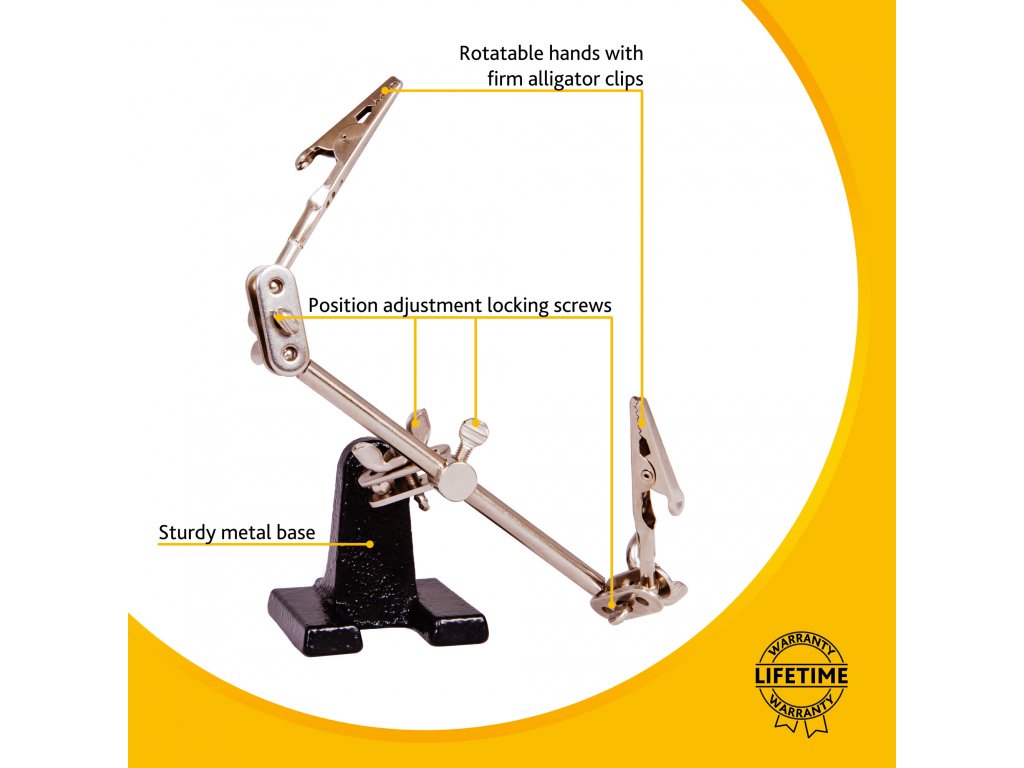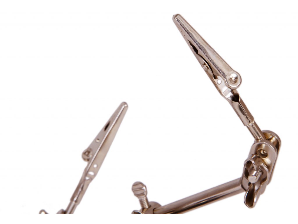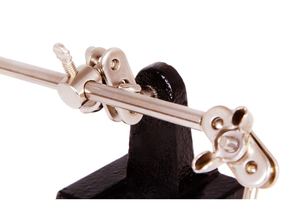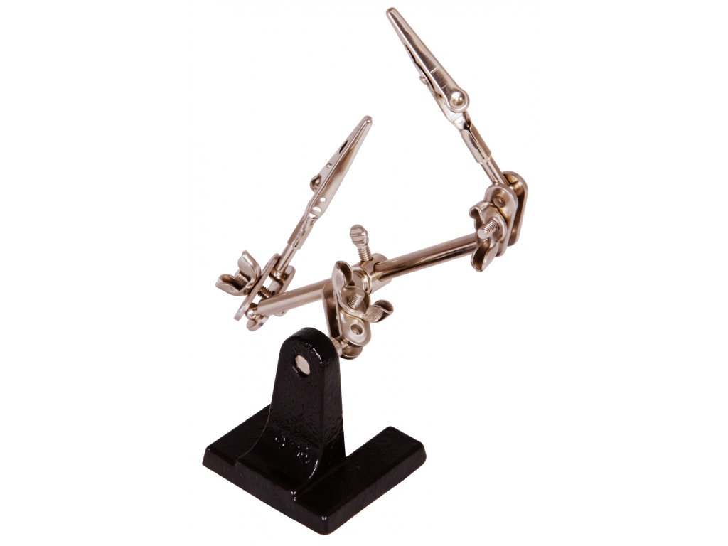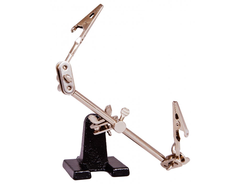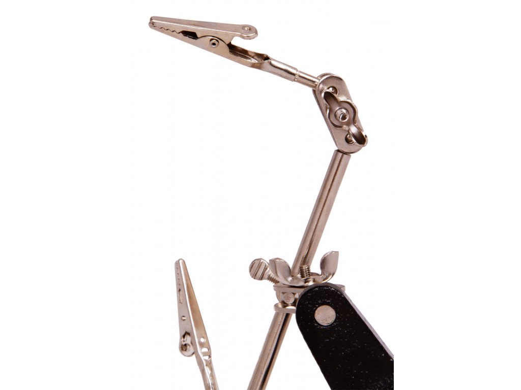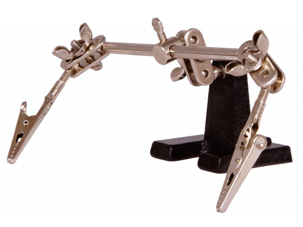 Zloženie tohto držiaka tvoria dve otočné "ruky", pričom každá je zakončená svorkou. Všetky komponenty na držiaku sú vyrobené z kovu, vďaka čomu je držiak Levenhuk odolný voči poškodeniu a predlžuje sa tým jeho životnosť. Vďaka tomu je celá konštrukcia držiaka spoľahlivá, stabilná a odolná. Skvelým pomocníkom bude pri práci s textíliami, na opravu hodiniek alebo v klenotníctve.