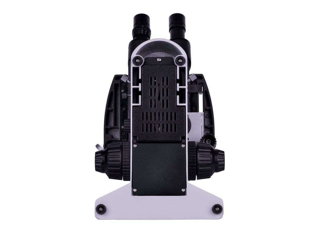 Binokulárna hlavica je naklonená o 30 °. Digitálny fotoaparát, ktorý nie je súčasťou balenia sa inštaluje do trinokulárneho tubusu. Vďaka možnosti otáčania okulárových tubusovo 360 ° si ich môžete prispôsobiť svojej výške. Do revolverového nosiča objektívov sa dá naraz inštalovať až päť objektívov. Štyri rovinné achromatické objektívy s korekciou na nekonečno sa nachádzajú v balení. Jeden z nich je fluorescenčný objektív so zväčšením 40x, a je určený pre fluorescenčné pozorovanie. Keď sú všetky objektívy nainštalované v revolverovom nosiči objektívov, zostáva jeden otvor voľný. Slúži na nastavenie polohy osvetľovacej sústavy pre pozorovanie v odrazenom svetle. Môžete tiež nainštalovať voliteľný objektív a získať tak ďalšie zväčšenie.