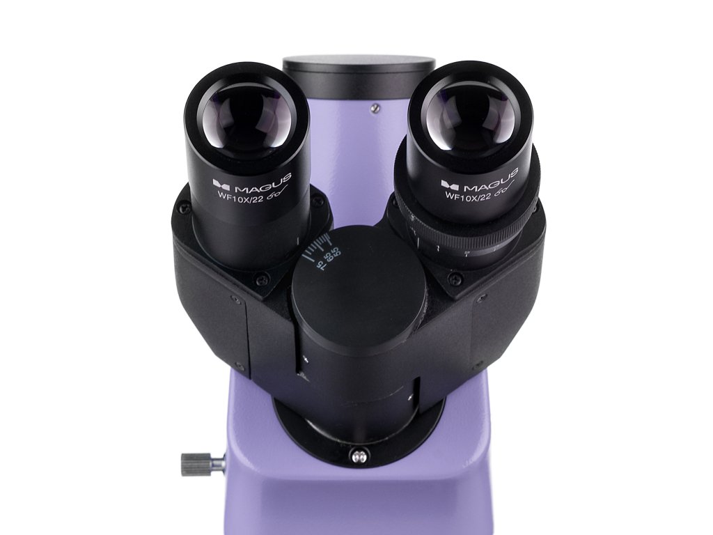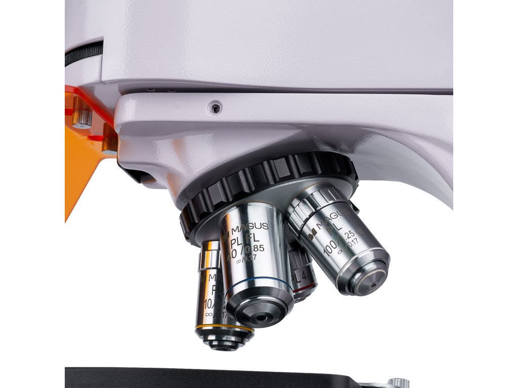 Trinokulárna hlava obsahuje dva okulárové tubusy na pozorovanie a jeden trinokulárny tubus na montáž digitálneho fotoaparátu. Digitálny fotoaparát, ktorý nie je súčasťou balenia sa inštaluje do trinokulárneho tubusu. Binokulárna hlavica je naklonená o 30 °. Vďaka možnosti otáčania okulárových tubusovo 360 ° si ich môžete prispôsobiť svojej výške. Do revolverového nosiča objektívov sa dá naraz inštalovať až päť objektívov. Štyri rovinné achromatické objektívy s korekciou na nekonečno sa nachádzajú v balení.Jeden z nich je fluorescenčný objektív so zväčšením 40x, a je určený pre fluorescenčné pozorovanie. Objektívy 4x, 10x a 100x sa využívajú pri mikroskopii svetlého poľa. Do voľného slotu revolverového nosiča objektívov môžete namontovať ľubovoľný objektív, čím dosiahnete ďalšie zväčšenie v rozsahu maximálneho zväčšenia mikroskopu. Revolverový nosič objektívov je orientovaný smerom dovnútra, preto budete vidieť objektívy vložené do optickej dráhy.