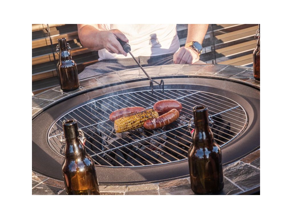 Vychutnajte si nezabudnuteľné chvíle pri grilovaní s priateľmi a rodinou so záhradným ohniskom s grilom Strend Pro Grill. Moderné ohnisko je vhodným riešením pre milovníkov grilovania. Ohnisko je ideálne pre záhradnú párty s rodinou, priateľmi alebo na rodinné oslavy. Zásluhou väčších rozmerov, je že viete naraz prichystať veľa chutných pokrmov. A to všetko s dokonalou chuťou zeleniny, rýb a mäsa na drevenom uhlí alebo dreve. Má využitie 3 v 1 teda ako ohnisko, klasický gril a stôl. V kovovom ohnisku v stredomorskom štýle môžete opekať svoje pochúťky na dreve aj na grilovacom uhlí alebo briketách. Po bokoch má záhradné ohnisko s grilom odkladací priestor, ktorý je dekoratívne dláždený a poslúži ako stôl. Súčasťou je aj kvalitný grilovací rošt s priemerom 58 cm, podporná tyč na drevené uhlie, 4 stoličky na sedenie a odkladací kryt, ktorý zakrýva celú grilovaciu plochu a mení ohnisko na plnohodnotný stôl. Celkový priemer ohniska je 105 cm, výška je 75 cm. Súčasťou moderného ohniska sú aj 4 stoličky, ktorých rozmery sú 45x45x36cm.