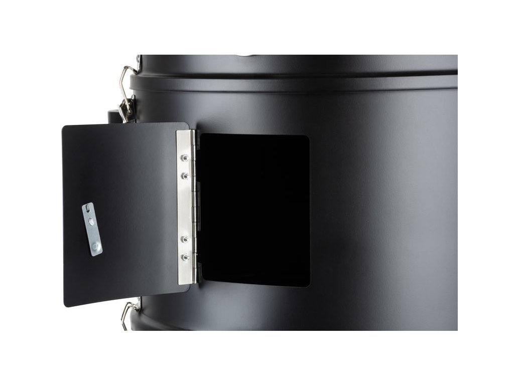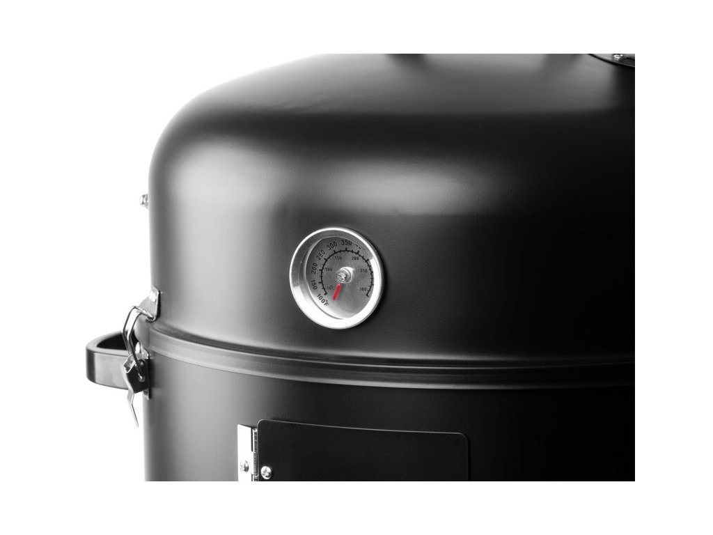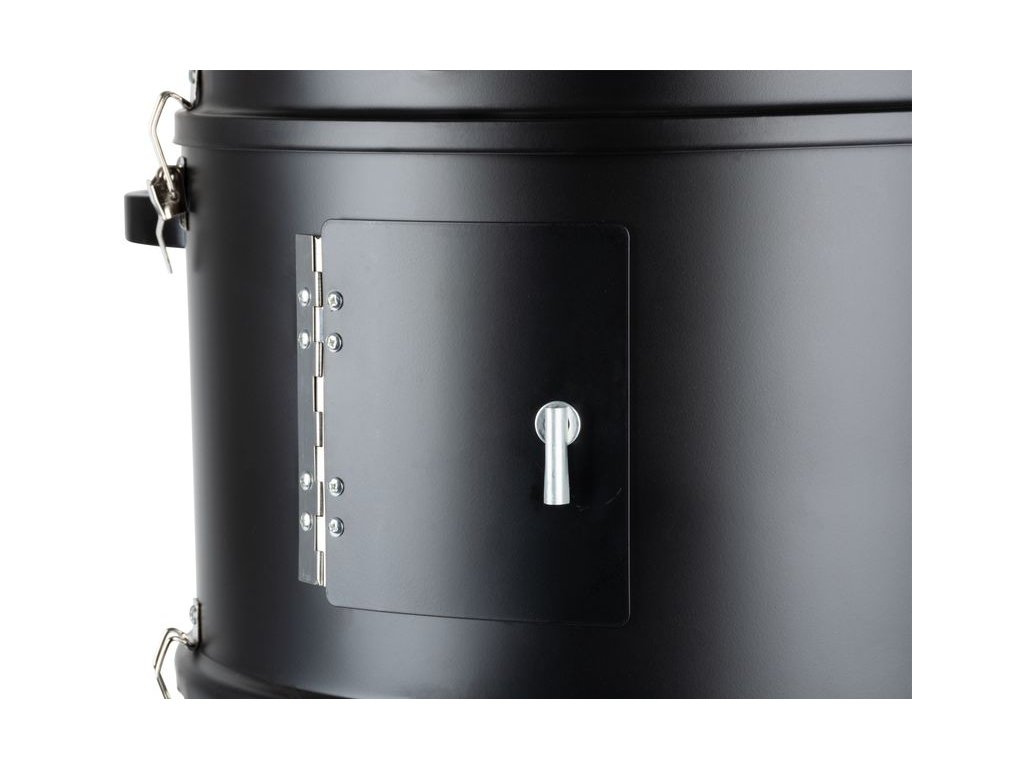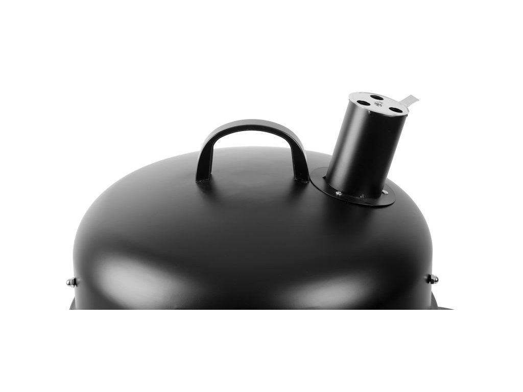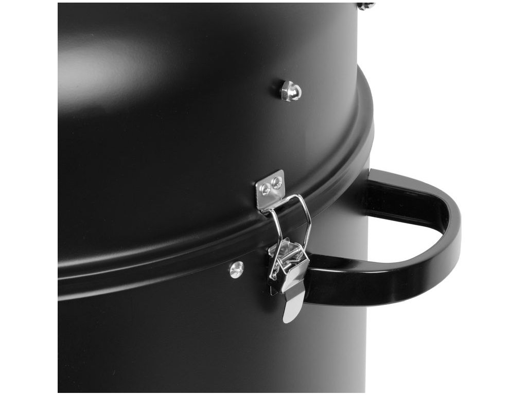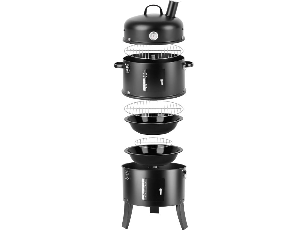 Záhradný gril na drevené uhlie je praktický multifunkčný domáci pomocník, ktorý ponúka bohaté možnosti a to nie len grilovanie, ale tiež klasické alebo parné údenie. Gril sa skladá z troch poschodí. Ak budete chcieť len grilovať, nie údiť, nie je potrebné založiť všetky tri poschodia, budú stačiť len dve časti. Prvé vrchné poschodie je určené na grilovanie, preto je v ňom umiestnená kovová mriežka. Priemer grilovacej mriežky je 44 cm. Ak to bude potrebné môžete ju zakryť vrchným krytom s rozmermi 41 x 16,5 cm. Súčasťou vrchného krytu je malý komín, ktorý slúži ako vetrací ventil. Spodné poschodie slúži na kúrenie, teda pre umiestnenie potrebného dreveného uhlia, brikiet alebo dreva. Na spodnej časti sa nachádzajú dvierka, ktoré sa dajú otvoriť, vďaka čomu sa dá regulovať intenzita ohňa. Spodné poschodie môžete použiť aj ako samostatne otvorené malé ohnisko na terase. Ak budete chcieť údiť je potrebné založiť strednú časť, v ktorej sa nachádza kovová nádoba s vodou. Výhodou údenia na pare je, že sa mäso nevysušuje. Všetky tri poschodia k sebe jednoducho prichytíte bočnými poistkami, čo vám zaistí stálu teplotu. Gril na drevené uhlie je v čiernej farbe a je vyrobený z plechu hrubého 0,4 mm. Má výšku 78,5 cm.