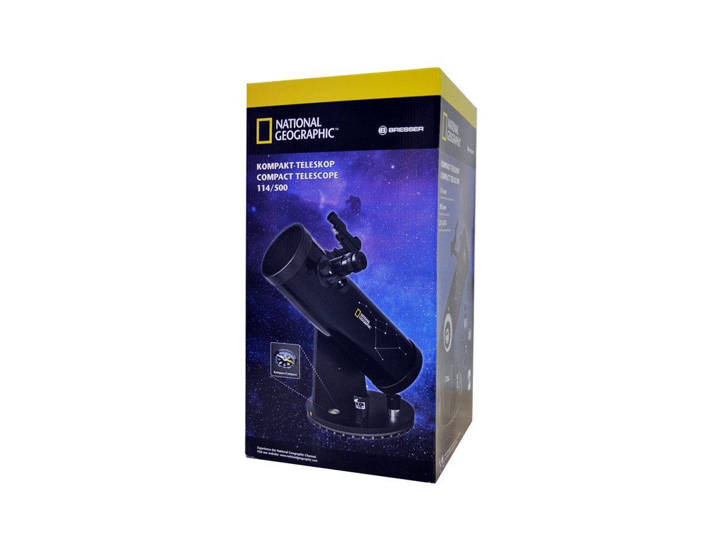 Teleskop na hviezdy Bresser National Geographic Dob 114/500 je Newtonov zrkadlový ďalekohľad inštalovaný na Dobsonovej azimutálnej montáži. Tento hvezdársky ďalekohľad je vybavený optikou vysokej kvality, jednoducho sa ovláda a má veľmi kompaktné rozmery. S pomocou tohto teleskopu, zbadáte dvojhviezdy s uhlovým odstupom cez 1,5 ", desiatky guľových hviezdokopov, difúzne a planetárne hmloviny , všetky objekty z Messierovho katalógu a najjasnejšie objekty z katalógu NGC.