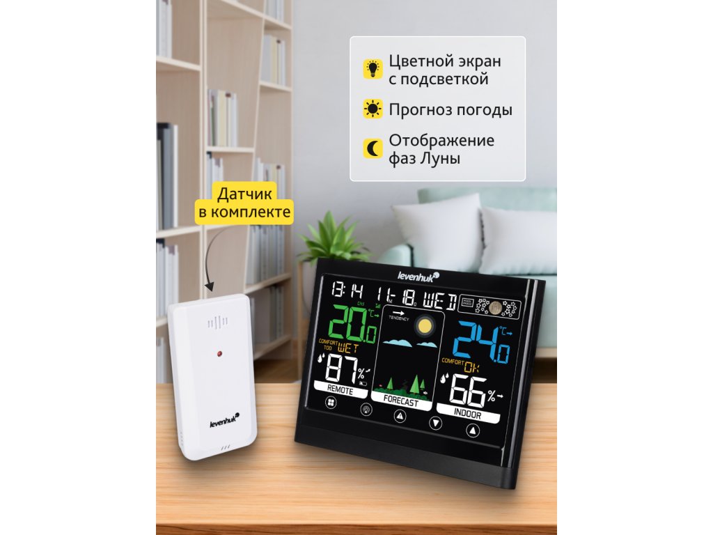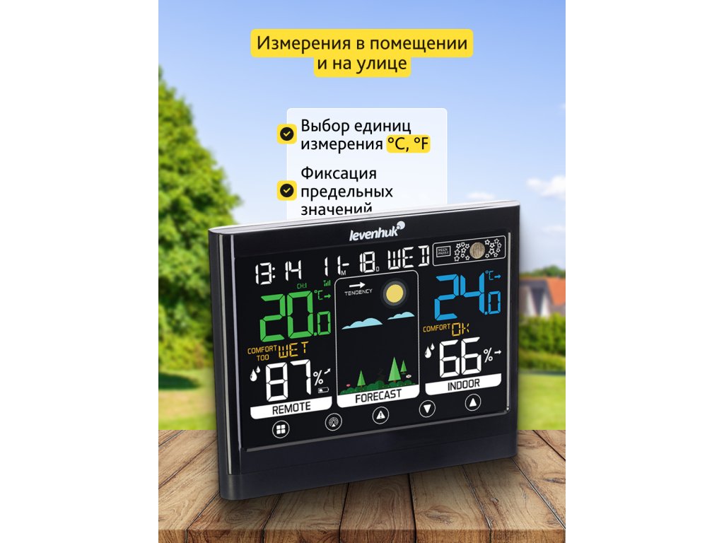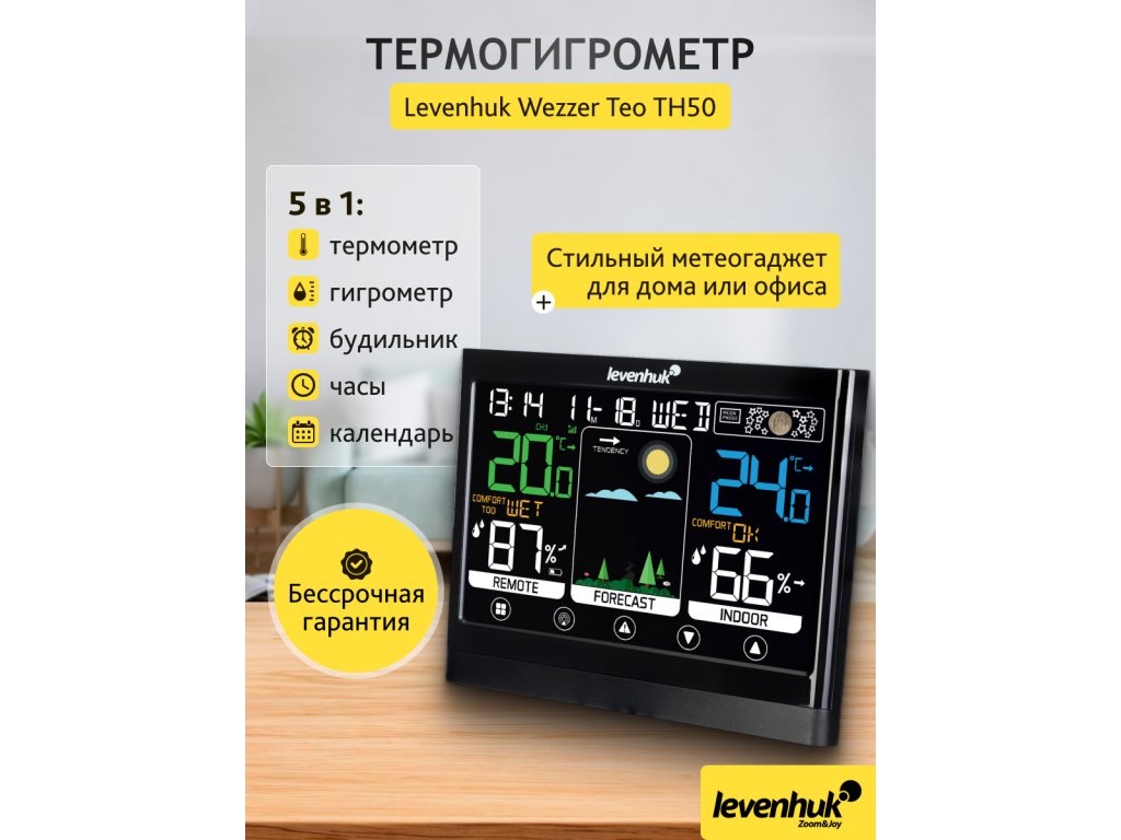 Termohygrometer Levenhuk Wezzer Teo TH50 je multifunkčné zariadenie s dotykovým ovládaním a senzorom, ktorý je súčasťou balenia. Medzi hlavné funkcie patrí snímanie teploty a vlhkosti v exteriéri a interiéri a následne vyhodnocovať tieto parametre, aby ste mali pod kontrolou poveternostné podmienky a informácie o negatívnych trendoch. Všetci vieme, že extrémne výkyvy vlhkosti zhoršujú chronické ochorenia a príliš vysoké alebo nízke teploty negatívne ovplyvňujú zdravie.