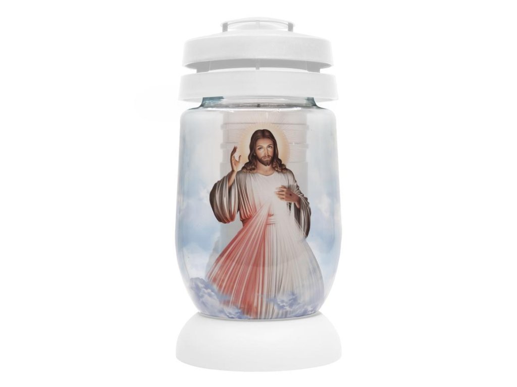 Kahanec s obrazom Ježiša s bielymi akcentmi. Vyrobené z kvalitného priehľadného skla, cez ktoré je krásne vidieť plameň. Vďaka veľkej základni je veľmi stabilný a vďaka špeciálnej štruktúre a "čiapke" je vložka vo vnútri dokonale chránená proti vetru a vode. Elegantný a moderný, vyzerá skvele ako hlavná dekorácia náhrobných kameňov. Doba horenia: 36 hodín. Balenie obsahuje 6 ks.