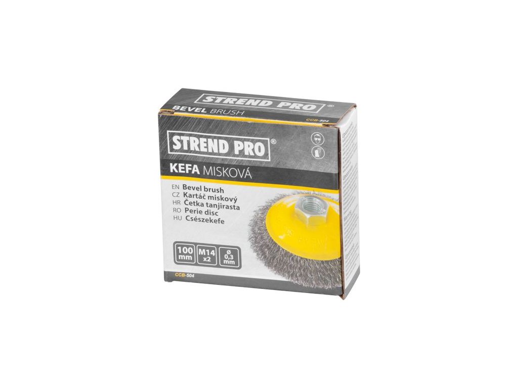 Okružná, misková, vlnitá kefa Strend Pro by nemala chýbať vo výbave profesionálnych remeselníkov, ale aj domácich kutilov. Priemer kotúča je 100 mm s typom upnutia M14. Drôt je vyrobený z ocele s hrúbkou 0,3 mm. Typ kotúča je vlnitý. Maximálne povolené otáčky sú 12 000 rpm. Používa sa na odstraňovanie korózie, farby a na očistenie povrchov.Dodatočné parametre