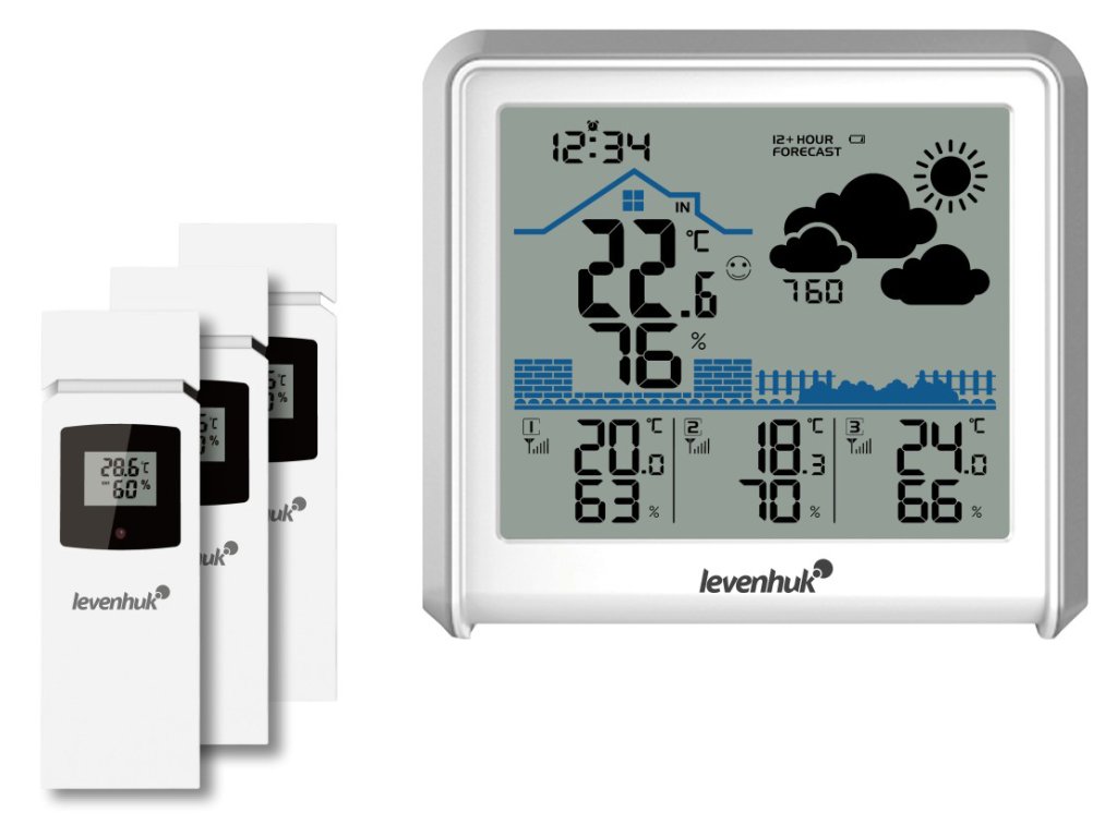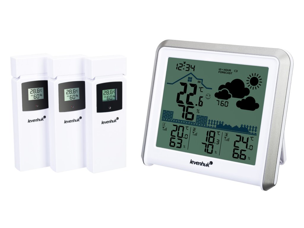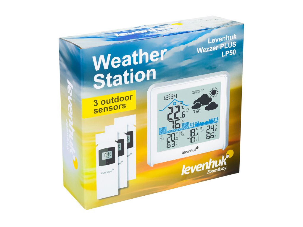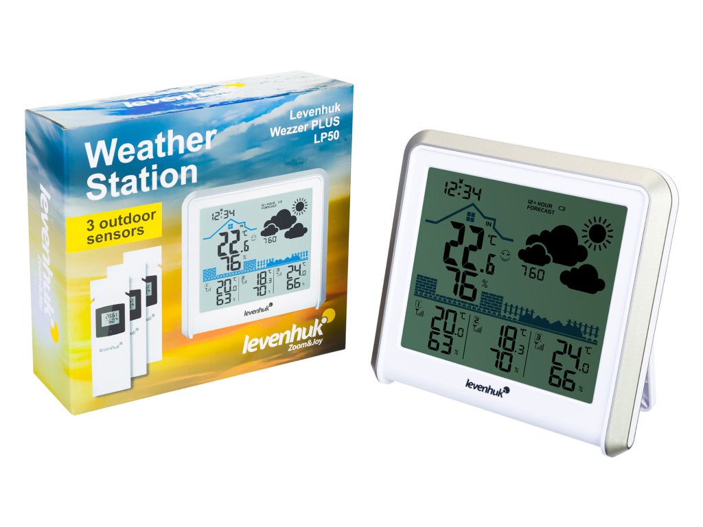 Levenhuk Wezzer PLUS LP50 je viackanálová meteostanica, ktorá meria teplotu a vlhkosť na štyroch miestach súčasne. Základňa meteostanice je vybavená tromi senzormi diaľkového ovládania, ktoré môžete umiestniť v rôznych miestnostiach alebo aj vonku. Meteorologická stanica bude určite dobrým pomocníkom tam, kde je nevyhnutné kontrolovať meteorologické údaje napríklad v miestach skladovania úrody alebo v hospodárskych budovách. Meteostanica sa jednoznačne hodí aj do priestranného bytu alebo kancelárie. Meteorologická stanica meria okrem vlhkosti a teploty, atmosférický tlak a na základe získaných údajov generuje predpoveď počasia na nasledujúcich 12 hodín.
