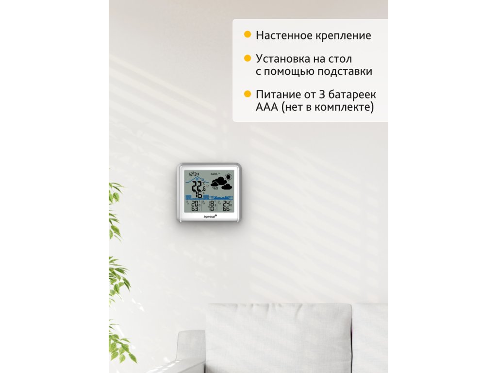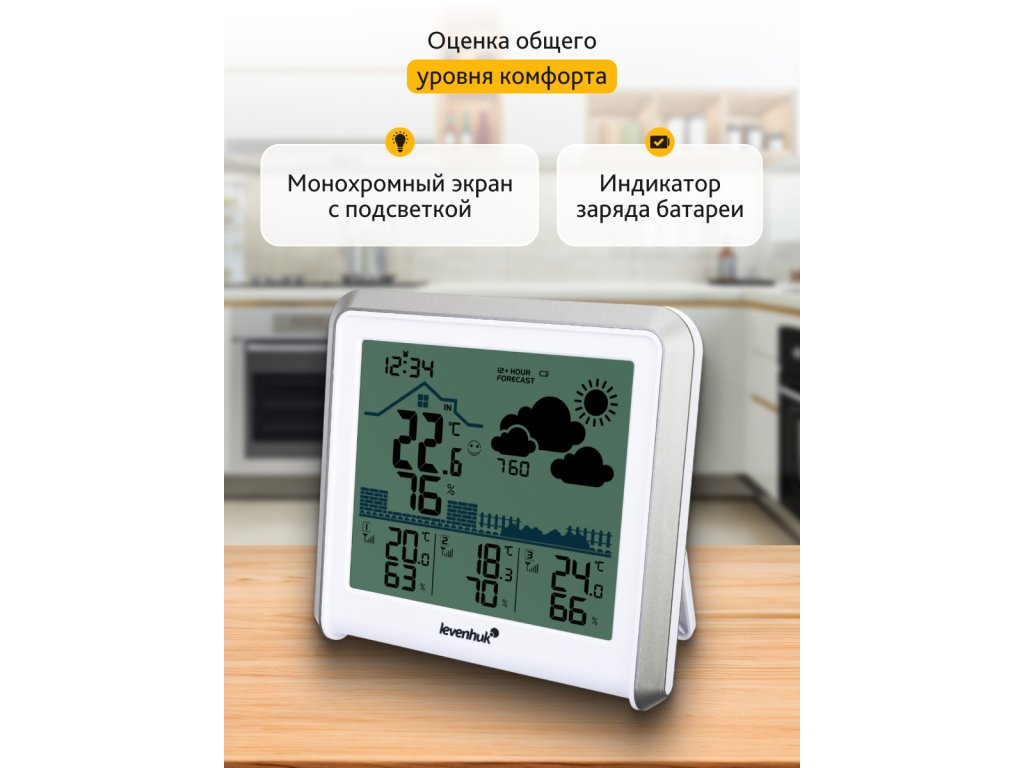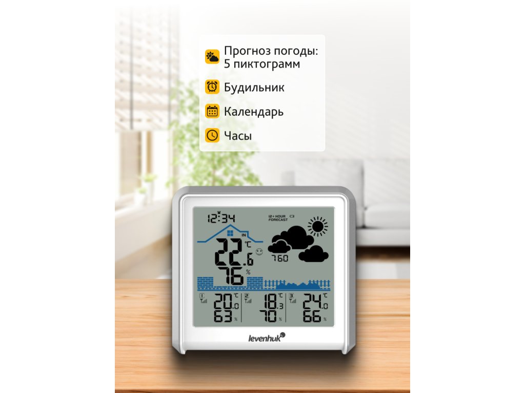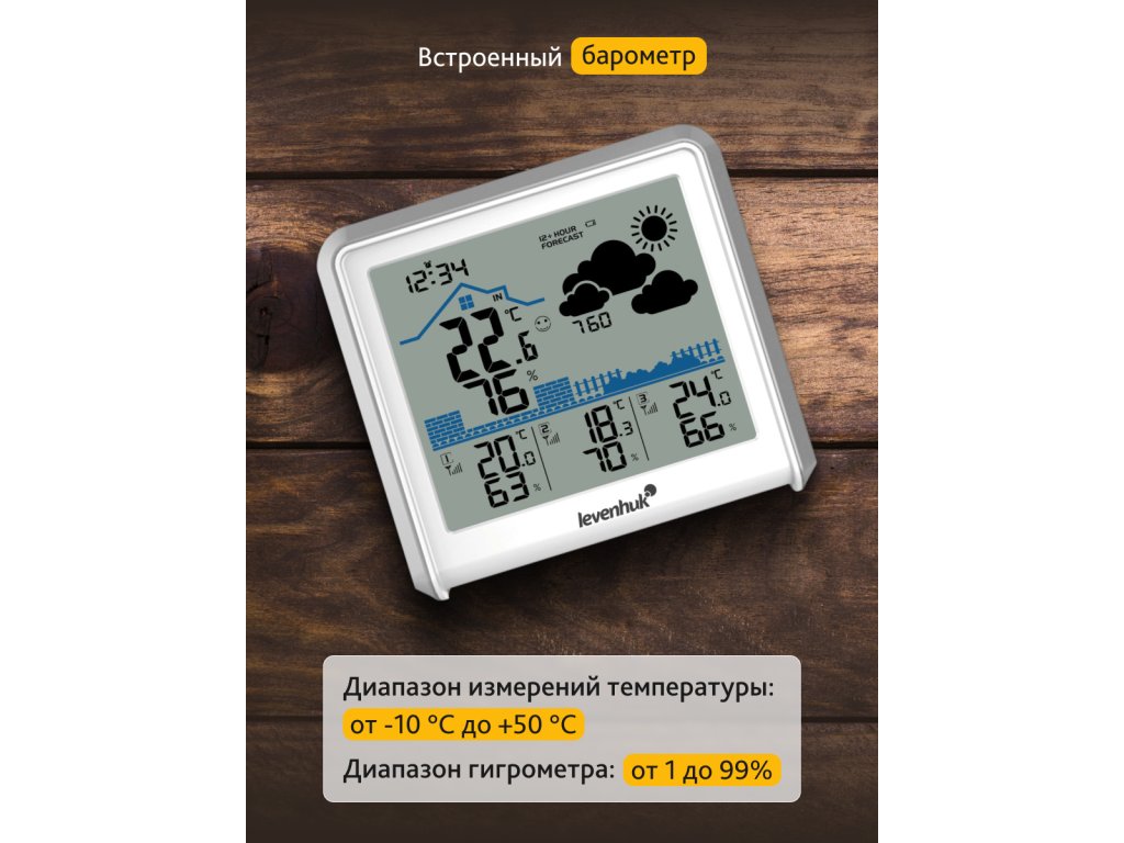 Levenhuk Wezzer PLUS LP50 je viackanálová meteostanica, ktorá meria teplotu a vlhkosť na štyroch miestach súčasne. Základňa meteostanice je vybavená tromi senzormi diaľkového ovládania, ktoré môžete umiestniť v rôznych miestnostiach alebo aj vonku. Meteorologická stanica bude určite dobrým pomocníkom tam, kde je nevyhnutné kontrolovať meteorologické údaje napríklad v miestach skladovania úrody alebo v hospodárskych budovách. Meteostanica sa jednoznačne hodí aj do priestranného bytu alebo kancelárie. Meteorologická stanica meria okrem vlhkosti a teploty, atmosférický tlak a na základe získaných údajov generuje predpoveď počasia na nasledujúcich 12 hodín.