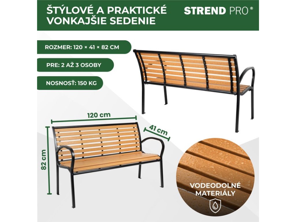 Lavička je určená pre umiestnenie do záhrady. Je vyrobená z ocele a plastu, vďaka čomu ju nie je potrebné ošetrovať ani špeciálne chrániť pre vonkajšími vplyvmi. Lavička sa vďaka povrchu jednoducho umýva. Svojou tmavozelenou farbou bude ladiť so zvyškom vašej záhrady. Rozmery lavičky sú 120 x 80 x 40 cm.