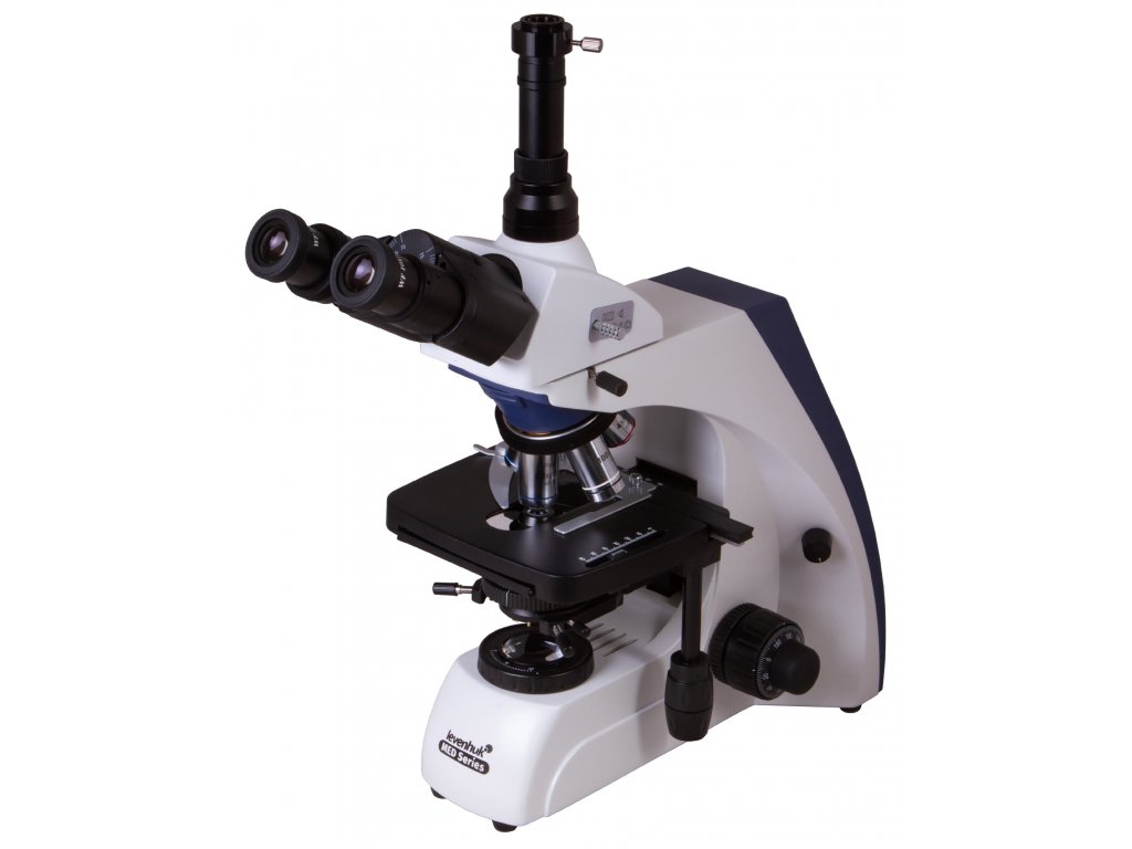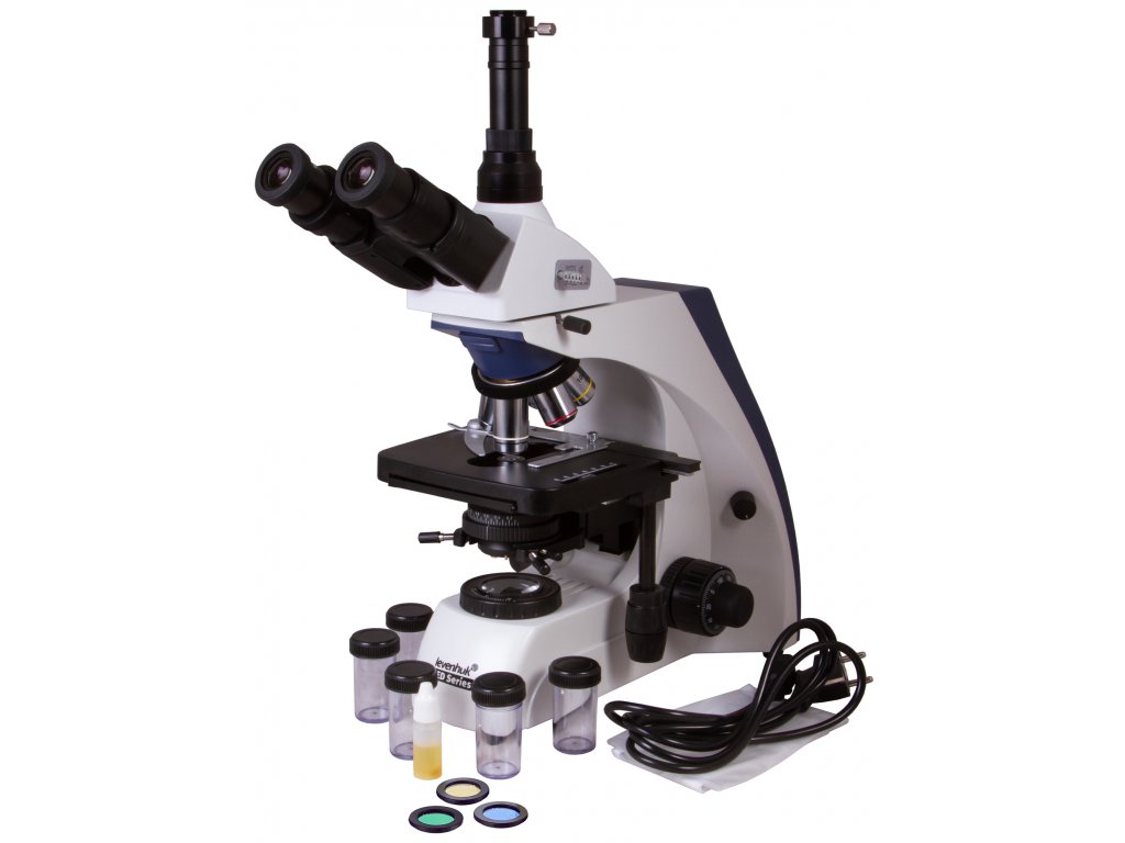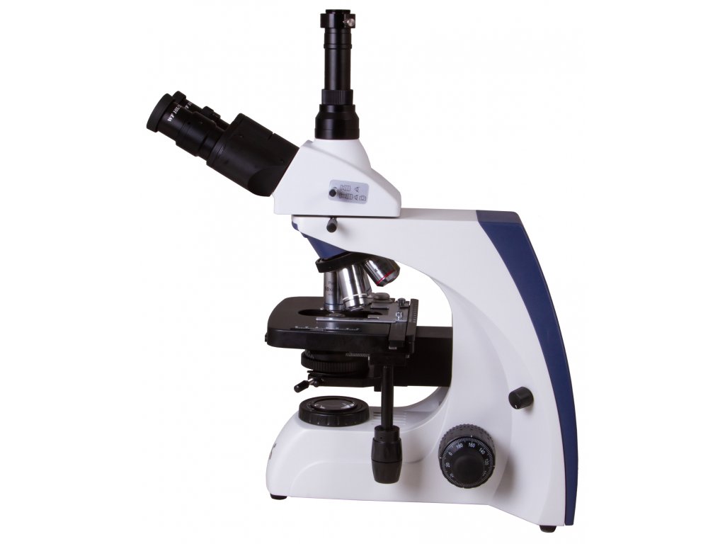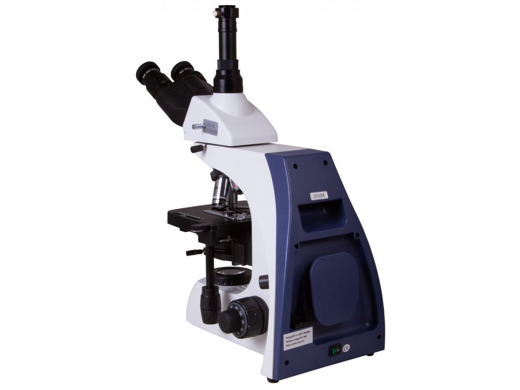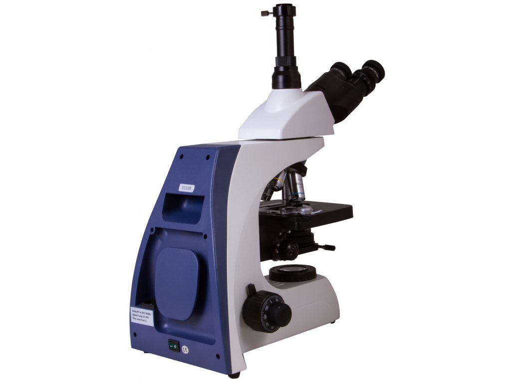 Zväčšenie: 40-1000x. Trinokulárna hlava, rovinné achromatické objektívy s korekciou na nekonečno, Abbe kondenzor s irisovou clonou a držiakom filtra.