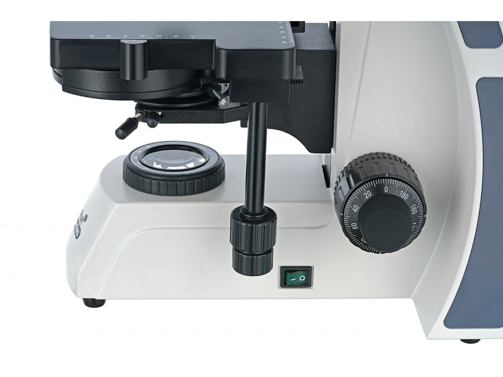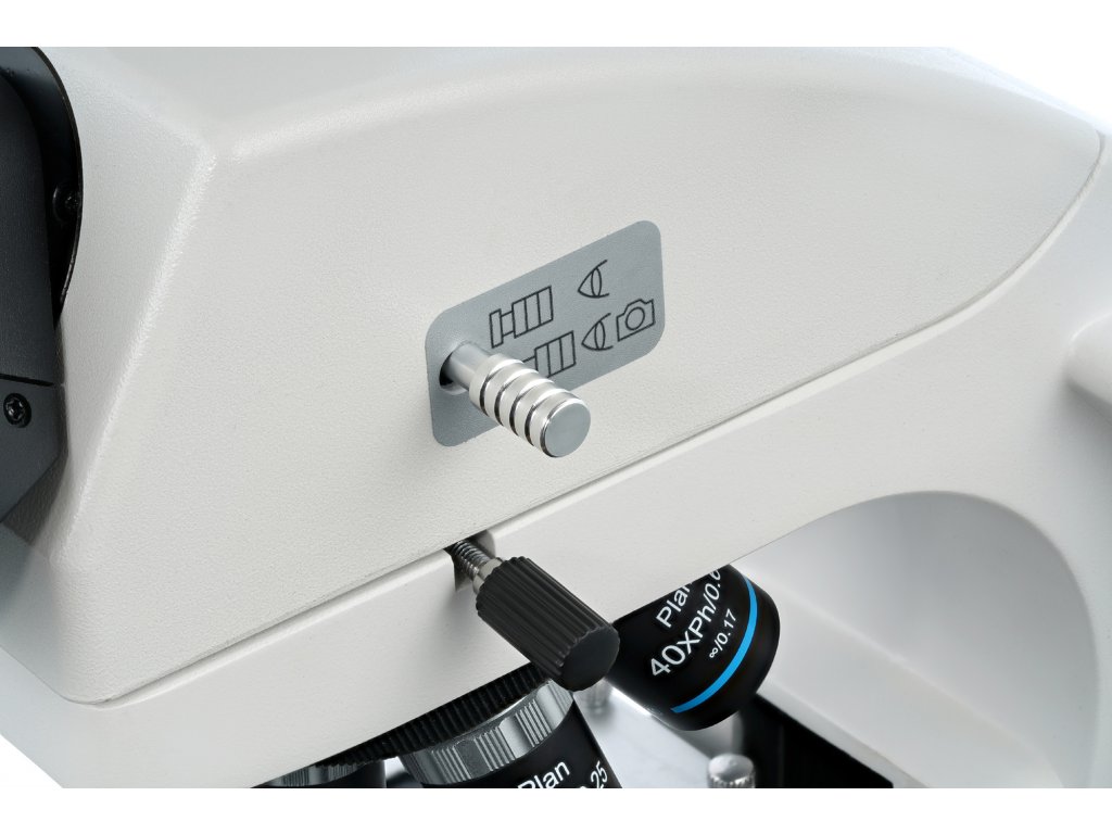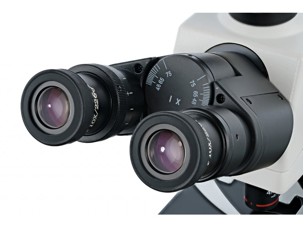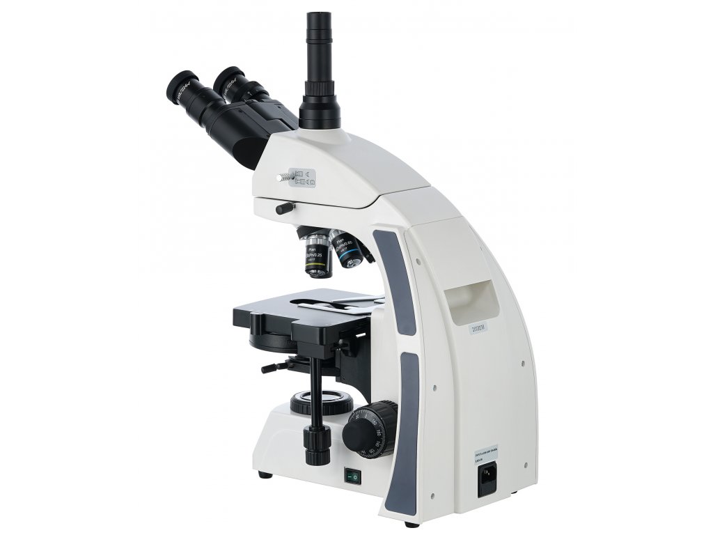 Súčasťou na nekonečno korigovaného optického systému sú infinitívne rovinné achromatické objektívy poskytujúce rôzne hodnoty zväčšenia (4x, 10x, 40x, 100x), ktoré ponúkajú jasný a kontrastný obraz s vysokým stupňom plošnosti. Zloženie mikroskopu ďalej zahŕňa trinokulárnu otáčaciu hlavicu v rozsahu 360° a dva širokouhlé okuláre WF10x/22 mm s možnosťou dioptrickej korekcie okulára. Vizuálna časť trinokulárnej hlavice sa nakláňa o 30°, zatiaľ čo okulárový tubus pre digitálny fotoaparát je vertikálny. Fotoaparát nie je súčasťou sady. Všetky optické komponenty tvorí kvalitné optické sklo s protiplesňovým povlakom. Objektív so 100x zväčšením je možné využiť pri pozorovaní s metódou olejovej imerzie.