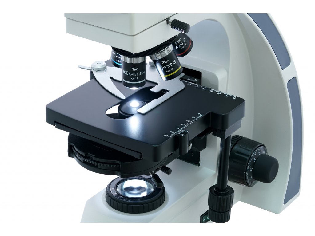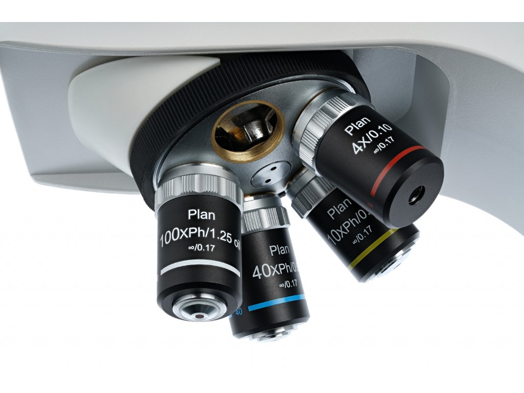 - Rovinné achromatické objektívy s korekciou na nekonečno a fázovým kontrastom: 4x, 10x, 40xs, 100xs (olej) s protiplesňovým povlakom