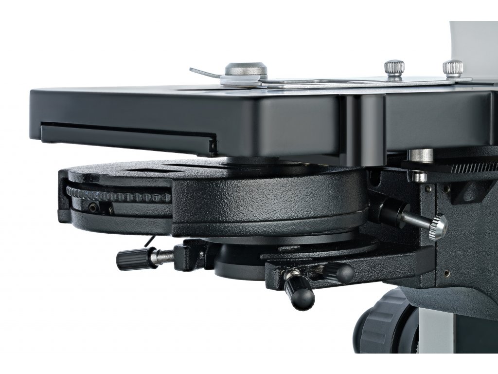 Stavba mikroskopu je dotvorená mechanickým pracovným stolíkom s mechanickou stupnicou, na ktorý je možné presne a rýchlo umiestniť mikroskopické preparáty. Pracovný stolík je pohyblivý v dvoch smeroch. Pod ním sa nachádza osvetľovací systém v podobe 5 W LED svetla s reguláciou jasu. K dispozícii je aj kondenzor fázového kontrastu, ktorý slúži na pozorovanie "suchou" metódou. Ostrosť obrazu je možné upraviť pomocou gombíkov pre hrubé a jemné zaostrenie. Zdrojom napájania je striedavý prúd a pred poškodením je tento kvalitný mikroskop chránený kovovou konštrukciou.