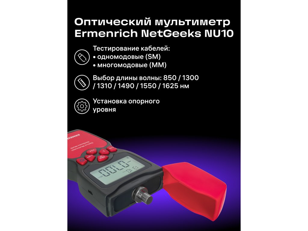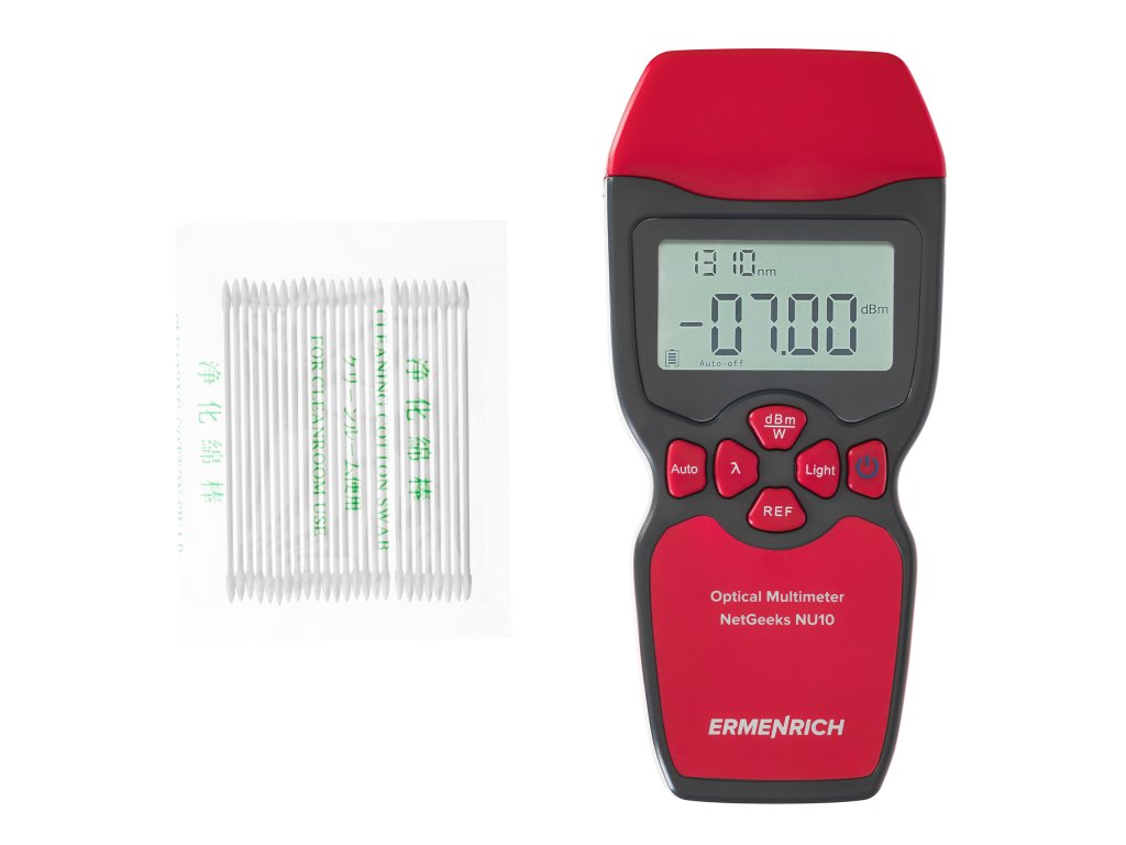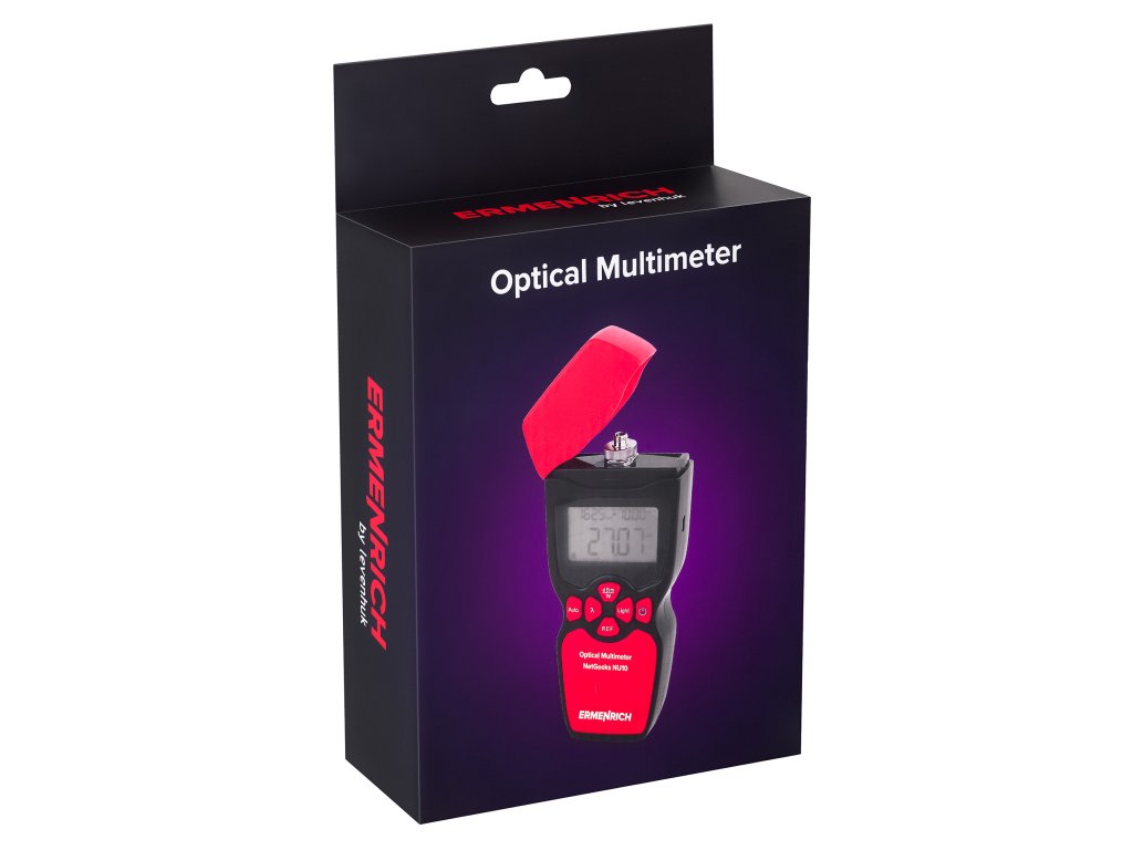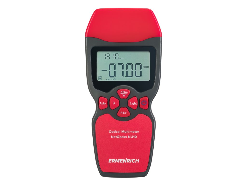 Optický, digitálny multimeter Ermenrich NetGeeks NU10 je kompaktný nástroj určený na testovanie komunikačných liniek z optických vlákien. Môžete s jeho pomocou merať absolútny optický výkon alebo relatívnu stratu optického výkonu medzi dvoma bodmi v kábli z optických vlákien. Je ideálny pre ľudí, ktorí inštalujú a udržiavajú káblové siete alebo kontrolujú a certifikujú telekomunikačné zariadenia.