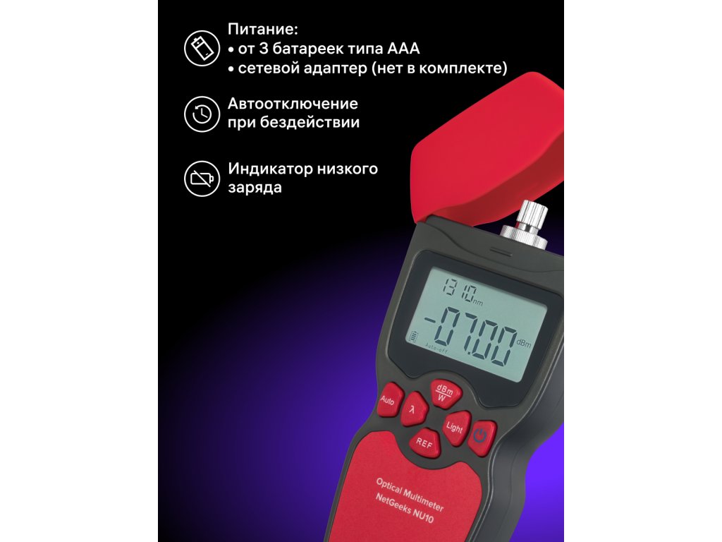 Optický multimeter ermenrich NetGeeks NU10 podporuje šesť vlnových dĺžok. Požadovanú vlnovú dĺžku si zvolíte jednoduchým stlačením tlačidla. Na pripojenie sa používajú rozhrania FC/SC/ST. Referenčnú úroveň pre aktuálnu vlnovú dĺžku si môžete jednoducho nastaviť, čo vám uľahčí určenie straty výkonu. Získané merania sa zobrazia na vstavanej podsvietenej LCD obrazovke. Prístroj je napájaný prostredníctvom na batérii 3x AAA ( nie sú súčasťou balenia). K dispozícii je aj funkcia automatického vypnutia, ktorá pomáha šetriť energiu.