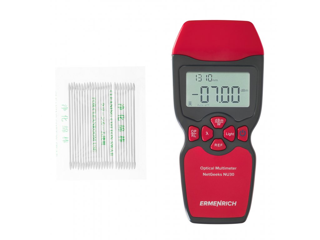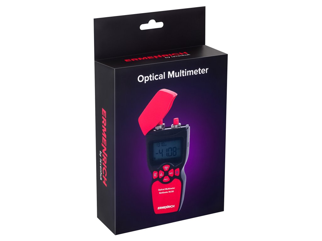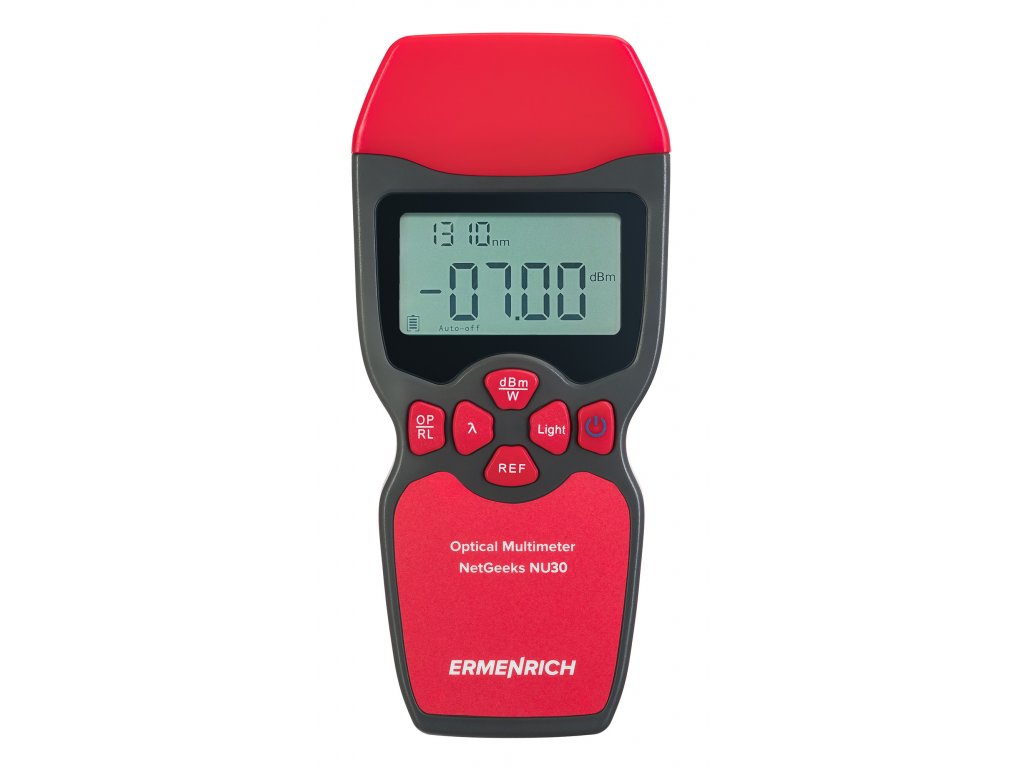 Optický multimeter Ermenrich NetGeeks NU30 má k dispozícii šesť vlnových dĺžok a konektory FC, SC a ST. Referenčnú úroveň môžete nastaviť pre ešte presnejšie meranie útlmu. Dáva možnosť automaticky vypočítať rozdiel medzi výkonom vstupného signálu a výstupného signálu. Môžete tiež využívať funkciu VFL s pulzným a nepretržitým režimom prevádzky. Funkcia je vhodná na lokalizáciu prerušených káblov alebo identifikovanie určitého špecifického kábla. Keď je možnosť aktivovaná, prístroj začne pracovať v režime vysielača pri vlnovej dĺžke 650nm. Ak digitálny multimeter zistí poruchu, bude ju indikovať červeným svetlom. Multimeter je kompaktný a jednoducho sa používa. Napája sa tromi štandardnými batériami AAA (nie sú súčasťou balenia.)