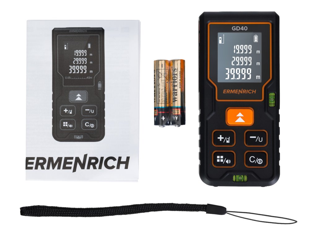 Ďalšou prednosťou laserového merača Ermenrich Reel GD40 je funkcia Pytagorovej vety. Táto funkcia sa vám hodí na automatický výpočet vzdialenosti medzi dvoma bodmi na základe nepriamych parametrov, teda ak laser nemôže byť namierený na jeden z nich. Laserový merač je napájaný batériami 2 AAA batériami, ktoré nie sú súčasťou balenia. Jedno balenie batérií vydrží na viac ako 5000 meraní. Ergonomický dizajn zabezpečuje pohodlnú obsluhu v náročnom pracovnom prostredí. Ak laserový merač nebudete nejaký čas potrebovať, tak určite oceníte funkciu automatického vypnutia pre úsporu energie, ktorá najskôr vypne laser a potom samotný laserový merač, aj indikátor vybitia batérie.