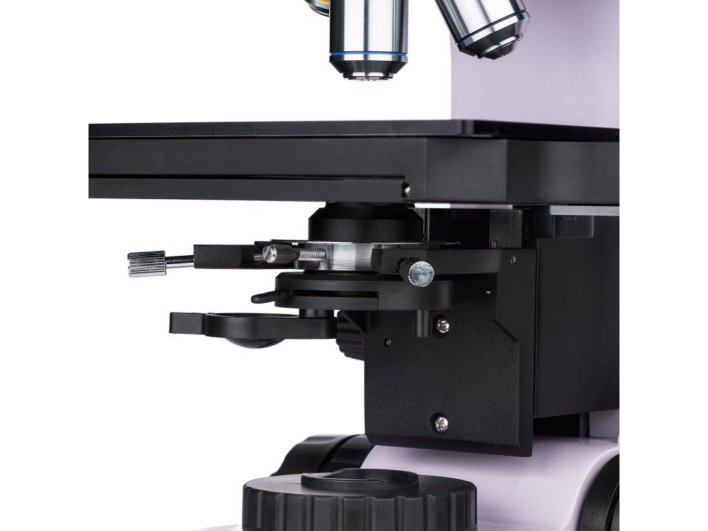 Maximálna výška pozorovaného preparátu, ktorú môžete umiestniť na pracovný stolík, je 20 mm. Vzorka sa posúva pohybom pracovného stolíka pozdĺž dvoch osí a je doplnená sklenenou doskou, ktorá sa využíva pri práci s nepriehľadnými vzorkami. Nastavenie zaostrenia je možné prostredníctvom mechanizmu hrubého a jemného zaostrenia, ktoré zaisťuje plynulý a presný proces. Hrubé zaostrenie disponuje aretačným gombíkom a nastavením tuhosti. Gombíky zaostrenia sa nachádzajú na oboch stranách základne mikroskopu. To zaisťuje pohodlnú prácu, kedy si môžete ruky pohodlne položiť na stôl.
