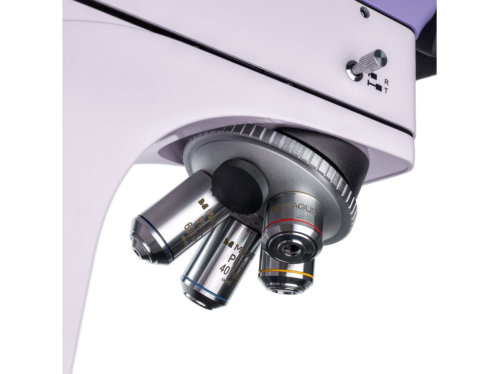 Trinokulárna hlavica disponuje trinokulárnym tubusom do ktorého sa dá namontovať fotoaparát. Fotoaparát nie je súčasťou balenia je potrebné si ho zakúpiť zvlášť. Svetelný lúč sa dá deliť rozdeliť do dvoch polôh, a to 100:0 alebo 0:100, čo znamená, že svetelný lúč je možné usmerňovať buď do digitálneho fotoaparátu, alebo do tubusu okulára. Trinokulárna hlavica je naklonená o 30 °, čo oceníte pri dlhodobom pozorovaní. Na ľavom tubuse si môžete prostredníctvom krúžku nastaviť dioptrie. V základnej konfigurácii poskytuje mikroskop zväčšenie od 50x do 600x. Ak chcete alebo potrebujete dosiahnuť vyššie zväčšenie môžete namontovať ďalšie ľubovoľné okuláre. Revolverový nosič objektívov je orientovaný smerom dovnútra. Naraz môžete namontovať päť objektívov. Štyri z nich sa nachádzajú v balení a jeden slot je voľný pre inštaláciu ďalšieho objektívu. Digitálny mikroskop používa rovinné achromatické objektívy s dlhou pracovnou vzdialenosťou, čo je ideálne pre mikroskopiu vo svetlom poli.
