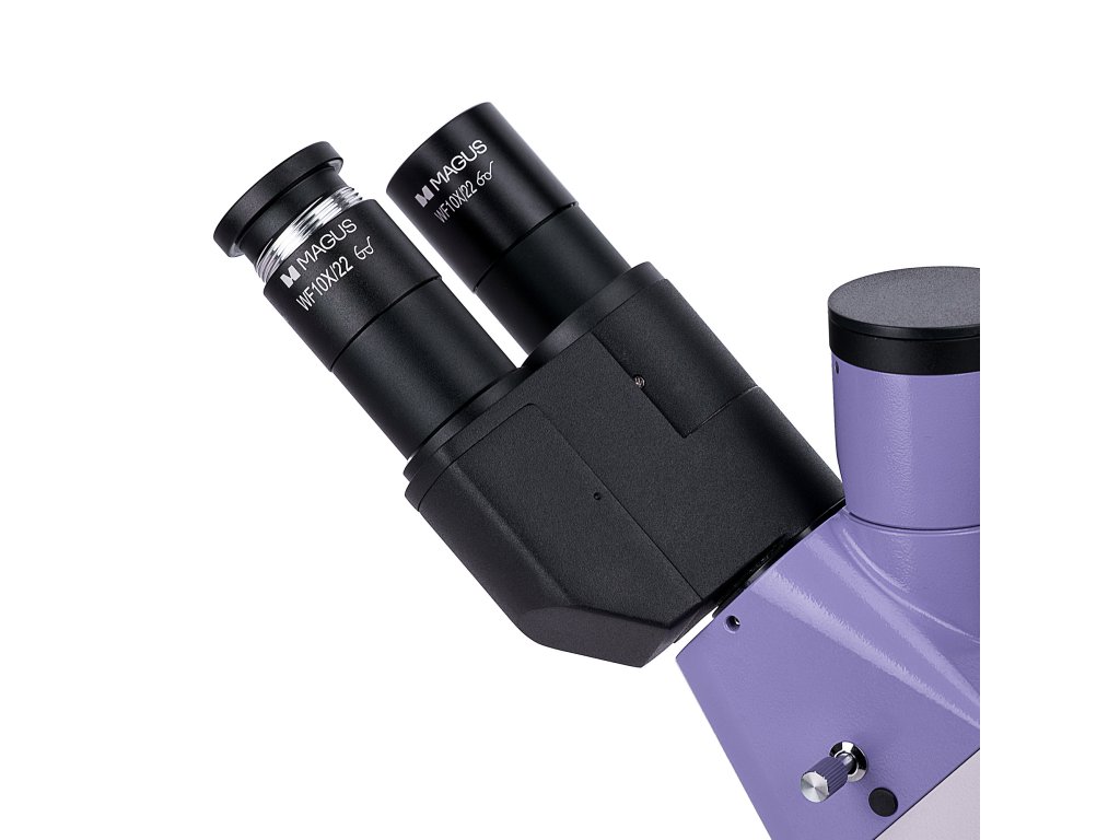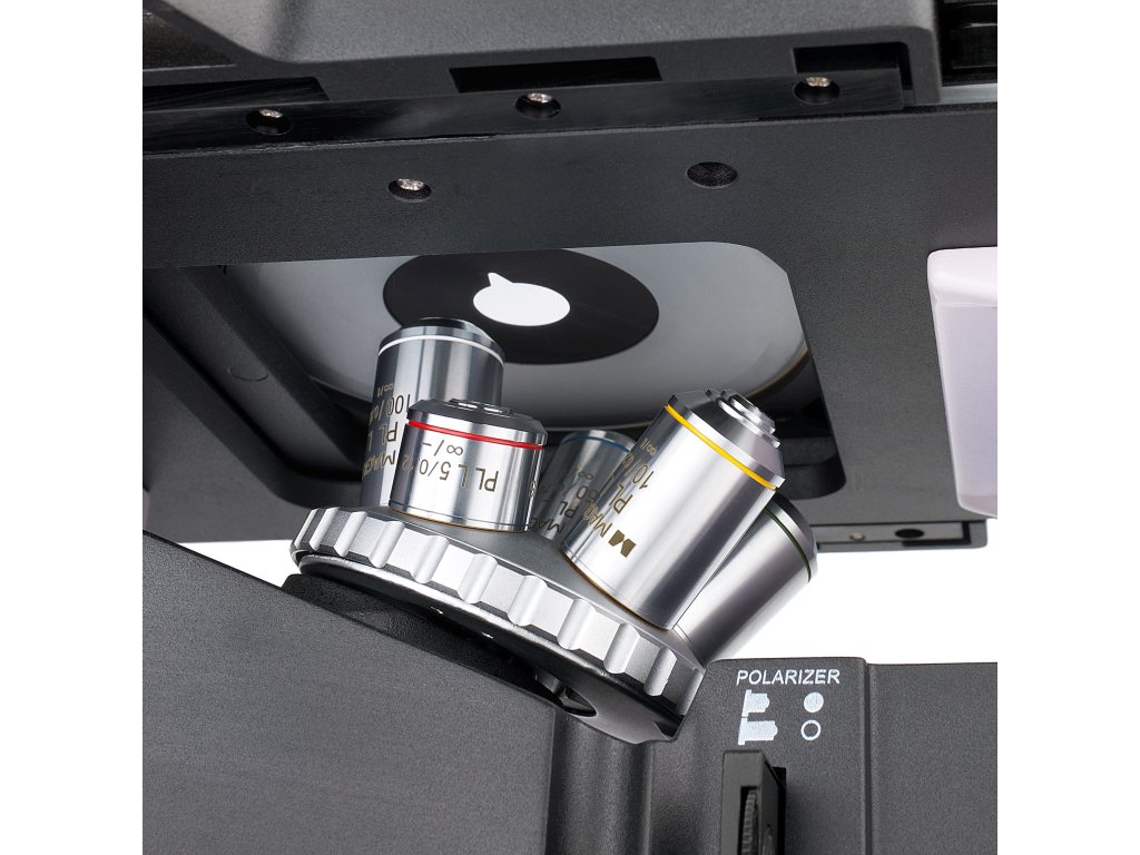 Metalurgický mikroskop disponuje trinokulárnou hlavicou so špeciálnej konštrukcie. Vďaka nej si môžete polohu okulárov nastaviť, a to otáčaním o 180 °. Digitálny fotoaparát sa umiestňuje do bočného portu pre fotoaparát, ktorý sa nachádza na tele mikroskopu. Monitor sa montuje do trinokulárneho tubusu na hlave mikroskopu. Svetelný lúč sa môže deliť na tele 100:0/0:100 a na trinokulárnej hlave 80:20. Revolverový nosič objektívov je umiestnený pod skúmanou vzorkou a vlastní 5 slotov pre objektívy. Všetky objektívy sa nachádzajú vo výbave mikroskopu (PL L5x/0,12 WD 26,1 mm, PL L10х/0,25 WD 20,2 mm, PL L20х/0,40 WD 8,80 mm, PL L50х/0,70 WD 3,68 mm a PL L100x/0,85 (suchý) WD 0,40 mm). Objektívy sú achromatické s korekciou na nekonečno s dlhou pracovnou vzdialenosťou. Objektívy si môžete zamieňať nemusíte pri práci používať len tie čo sa nachádzajú v balení. V základnej konfigurácii mikroskop ponúka zväčšenie od 50x do 1000x. Môžete ho zvýšiť pridaním zakúpených objektívov.