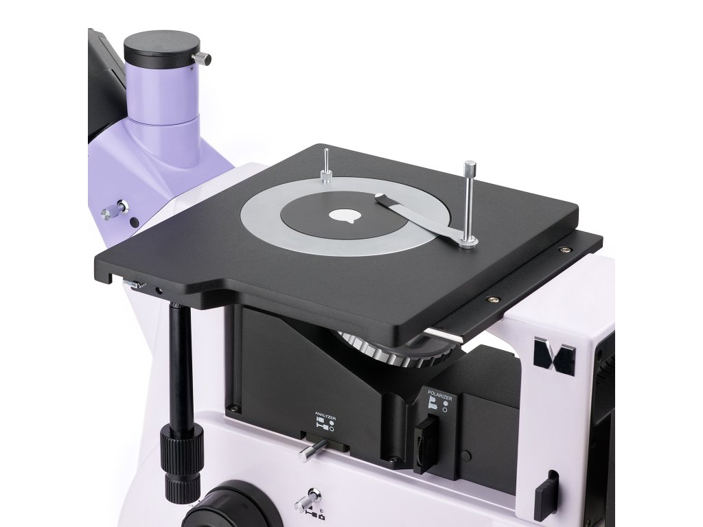 ✓ Štúdium veľkých a ťažkých vzoriek pomocou mikroskopických techník vo svetlom poli a polarizačná mikroskopia; mala by sa opracovať iba jedna strana vzorky✓ Veľký pracovný stolík, kruhové otočné dosky stolíka s otvormi s priemerom 10 mm, 20 mm a 30 mm