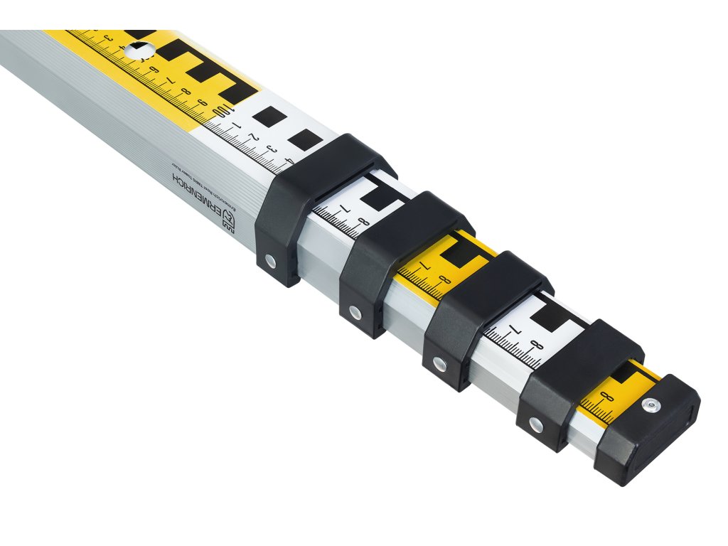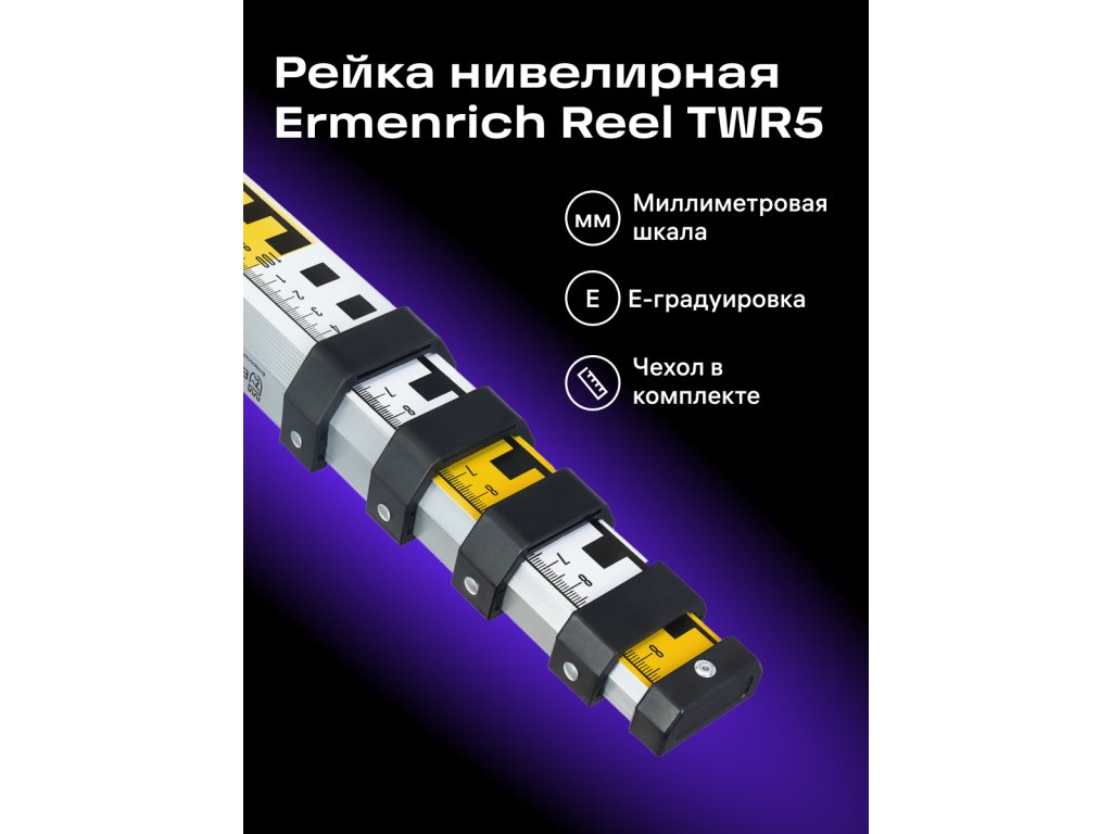 Nivelačná lata Ermenrich Reel TWR5 je potrebná pri práci s geodetickými prístrojmi, ako sú optické nivelačné prístroje. Lata vlastní teleskopické prvky, ktoré sú vyrobené z hliníka. Nivelačná lata je ľahká a jednoducho sa skladá. Mierka je obojstranná, kedy na jednej strane nájdete milimetrové značky a na druhej strane sa nachádzajú E-delenie. Dĺžka vytiahnutej laty dosahuje 5 metrov.