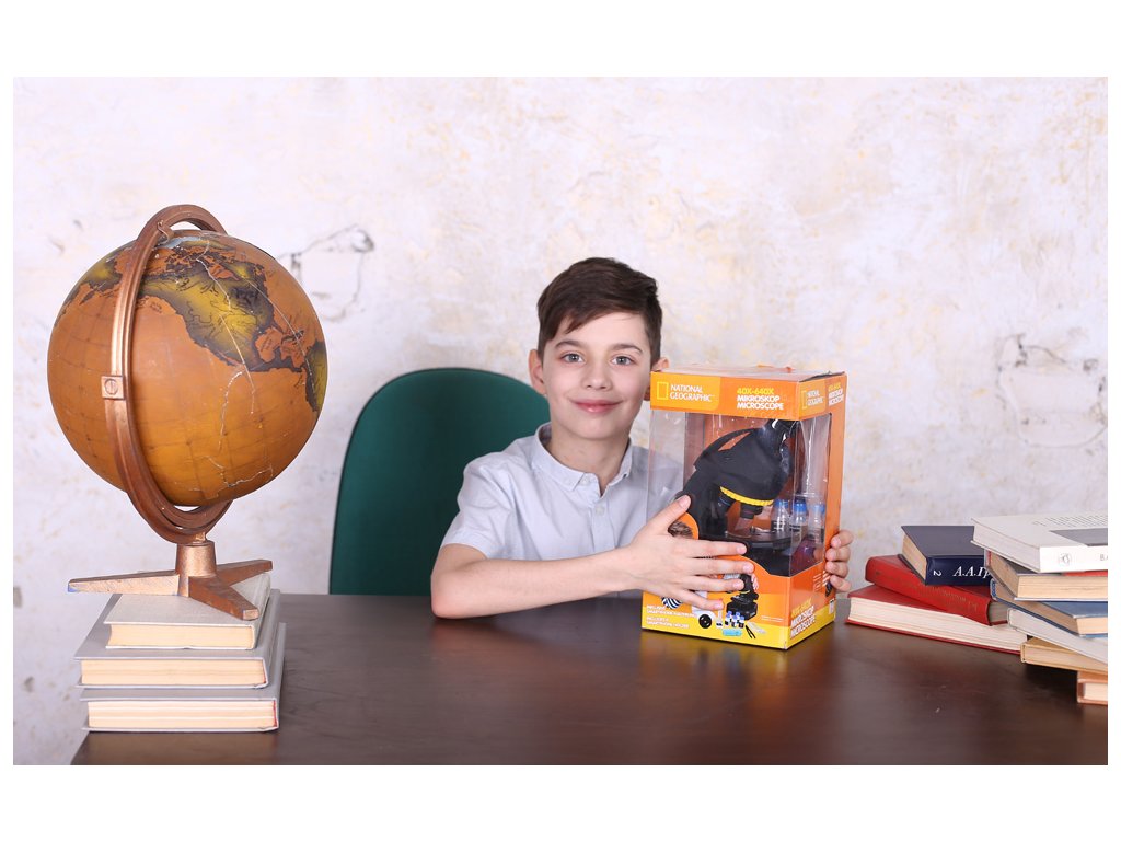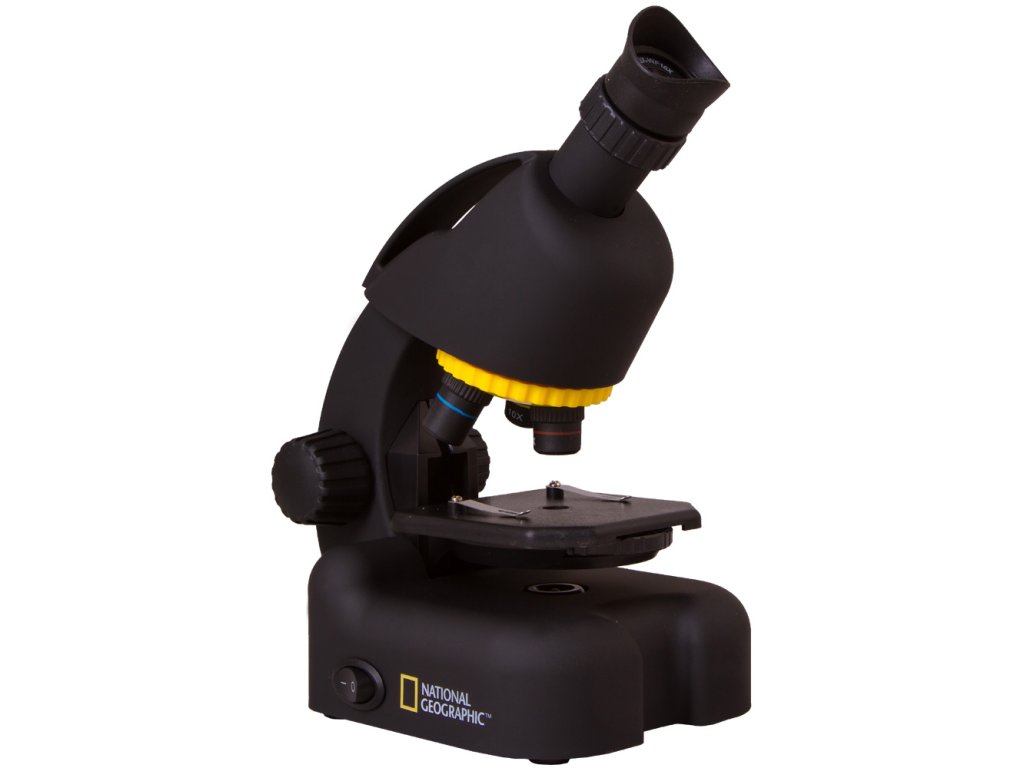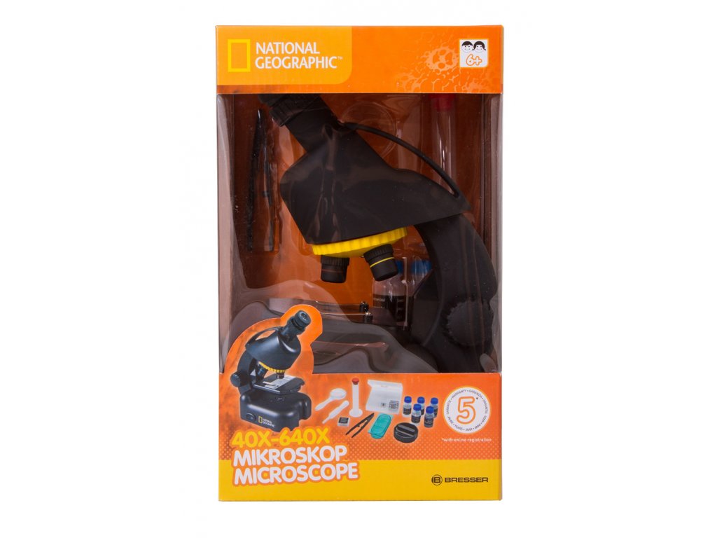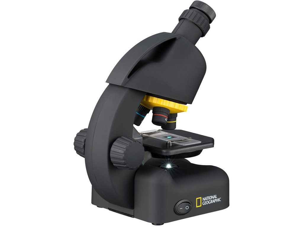 Zloženie mikroskopu tvorí optika vyrobená z vysoko kvalitného optického skla, okulár WF10x - WF16x a tri objektívy v revolverovom nosiči, ktoré ponúkajú tri pevné hodnoty zväčšenia v rozsahu od 40x do 640x. Meniť nastavenie zväčšenia môžete jednoduchým pootočením revolverového nosiča. Skvelý optický mikroskop pre deti Bresser National Geographic 40-640x disponuje spodným LED osvetlením, ktoré je napájané prostredníctvom batérií, ktoré sú súčasťou balenia. Detský mikroskop ponúka možnosť pozorovania mikroskopických preparátov v prechádzajúcom svetle.