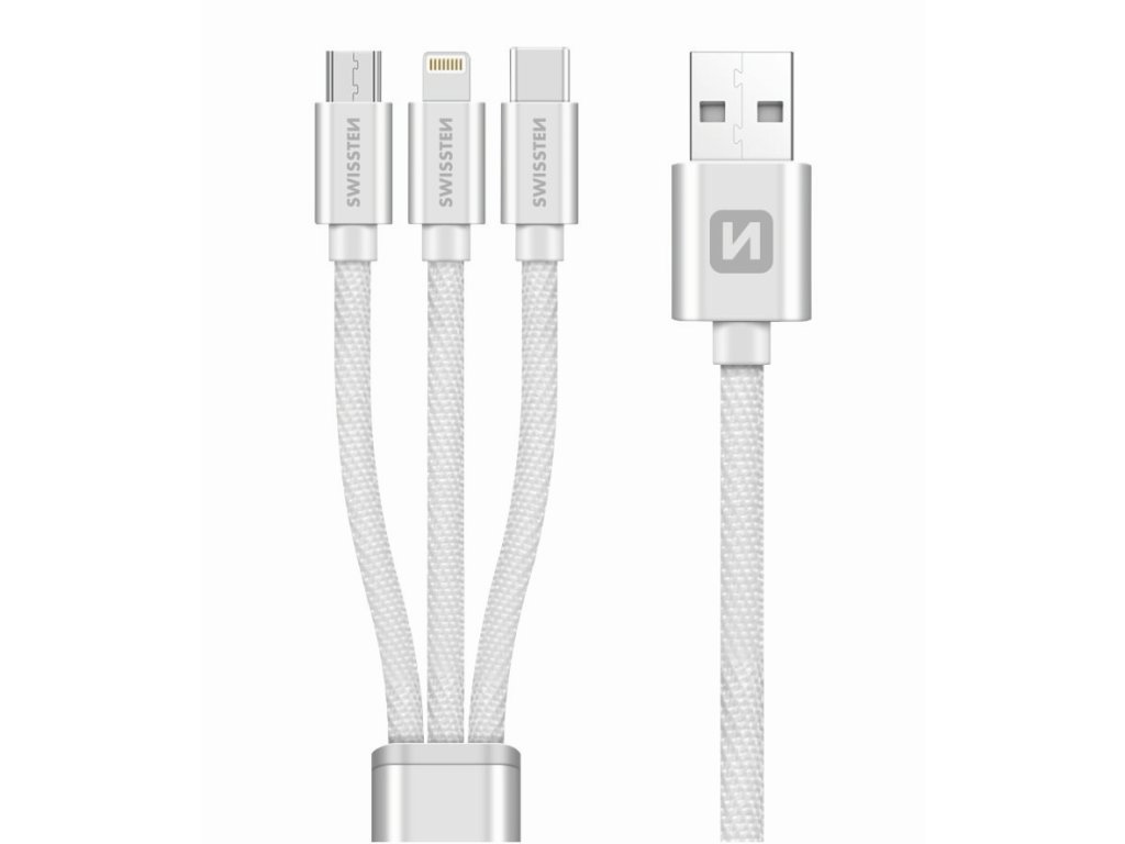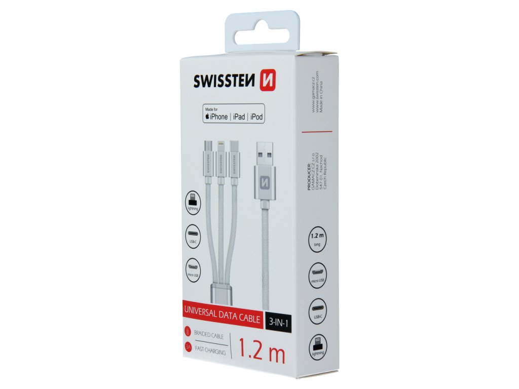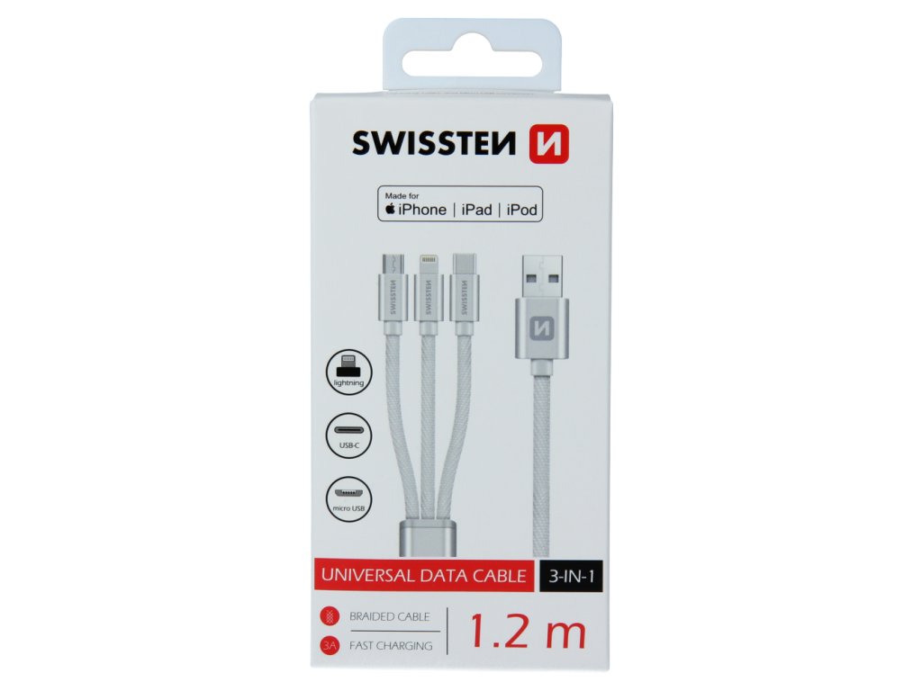 Textilný dátový kábel Swissten 3in1 MFi 1,2 M - stieborný
