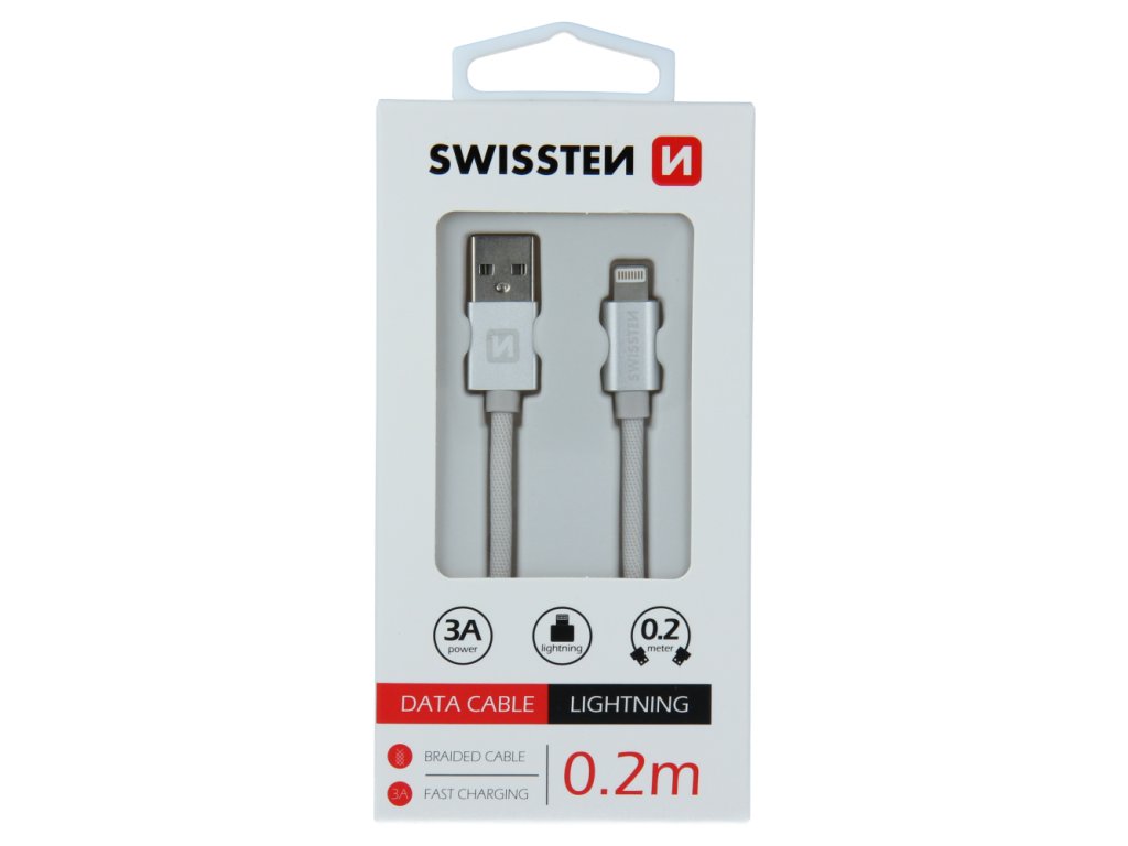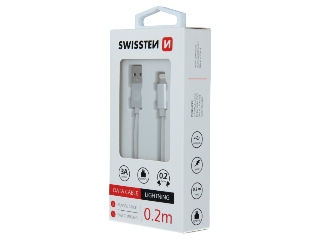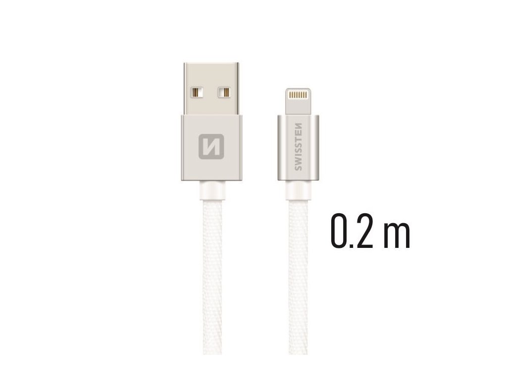 Textilný dátový kábel Swissten USB / LIGHTNING 0,2 M - strieborný