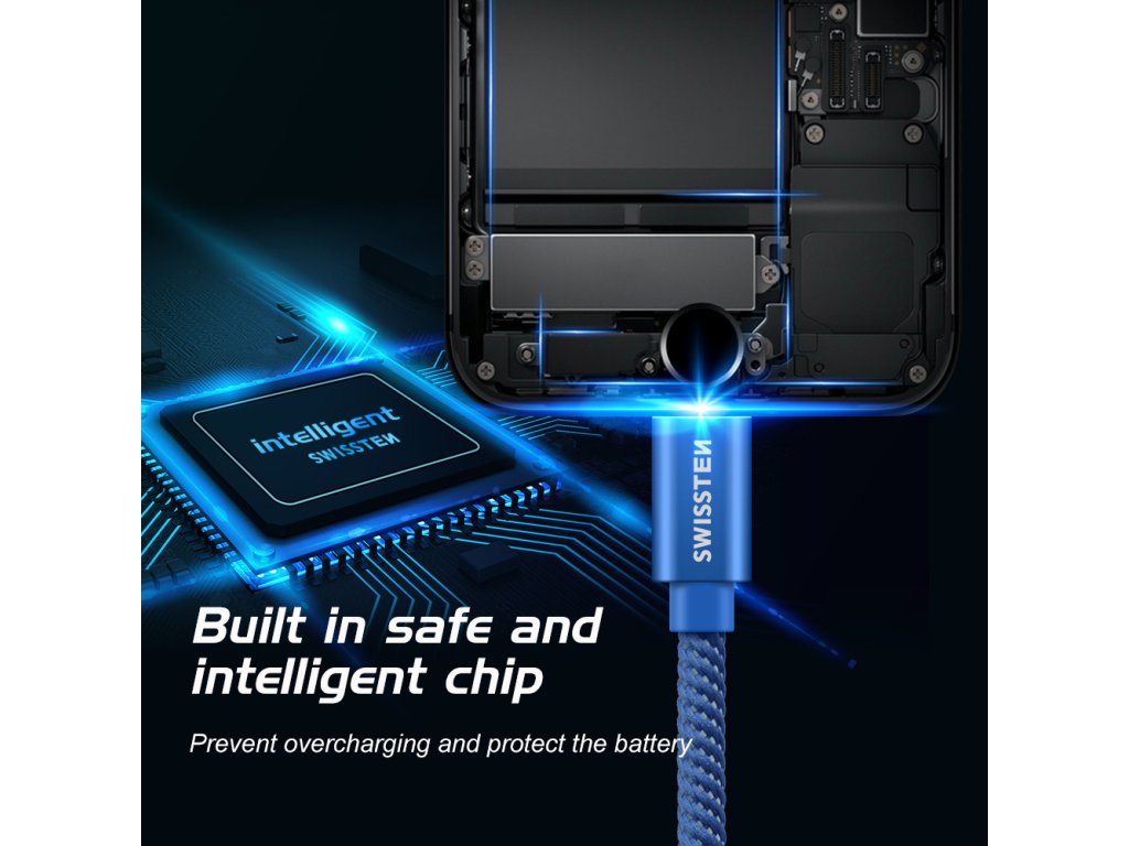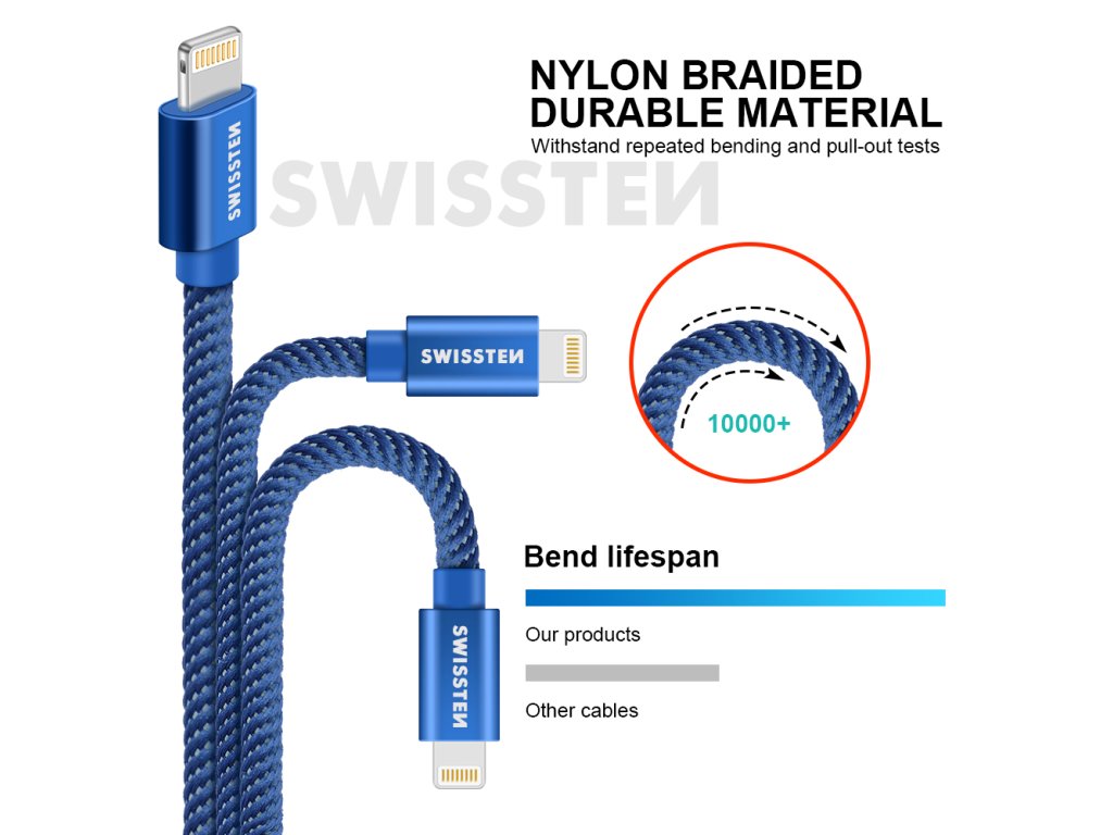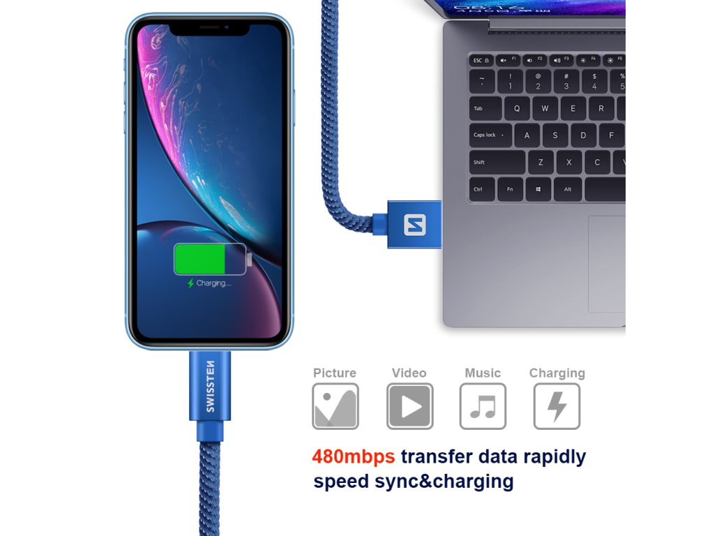 Dátový kábel Swissten USB/Lightning s kvalitným textilným opletením a kovovými krytmi konektorov. Kovový kryt konektora je odolnejší proti mechanickému poškodeniu ako bežné plastové kryty konektorov. Keďže kábel má dĺžku 2,0 m je ideálny pre použitie napr. do nákladných áut, do áut pre rodiny alebo pre ľudí, ktorí často dobíjajú a majú ďaleko zásuvku a počas nabíjania potrebujete volať. Dátový kábel je zosilnený a preto dokáže preniesť väčší prúd (až 3A) a taktiež zvládne rýchly prenos dát 480 Mb/s. Životnosť kábla je cca 10 000 ohybov. Balené v blistri Swissten.